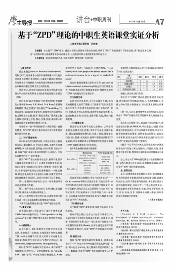【摘要】 本文基于“ZPD”理论,通过对中职生英语学习现状的分析,架构了“ZPD”课堂并进行了课堂试验,将“最近发展区理论”运用到中职生英语课堂教学设计理念中,从而促进中职生英语课堂教学的有效性。
