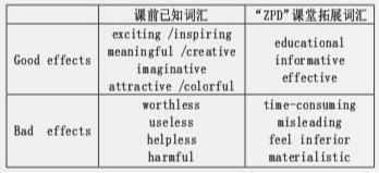 而在问卷调查课堂分享补充环节,educationa l,informational,misleading等补充的词汇难度较大,我们便直接采用了海报直观教学,帮助学生实现“ZPD”内的潜在词汇发展水平。