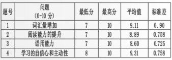 学生对于“ZPD”理论构建的课堂持肯定态度,因为每项平均分都在8.60以上,标准差都较小,不超过0.90,因此本数据有效,学生的意见相对比较集中。