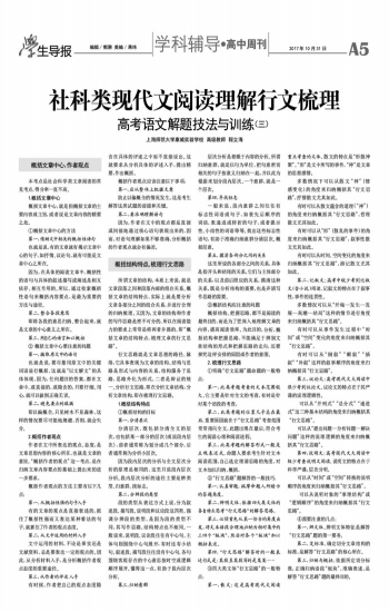 概括文章中心、作者观点 本考点是社会科学类文章阅读的常见考点,得分率一直不高。 1.概括文章中心 概括文章中心,就是指概括文章的主要内容或主旨,或者说是文章内容的精要之处。 ①概括文章中心的方法 第一,借助文中相关的概括性语句 也就是说,有的文章就有揭示文章中心的句子,如抒情、议论句,就有可能是文章中心之所在。 因为,在具体的阅读文章中,概括性的语句与具体的叙述描写或阐述是相互依存、相互作用的。所以,通过检索概括性语句来概括内容要点,是最为重要的方法与途径。 第二,整合各段意思 即将各段的意思归纳、整合起来,就是文章的中心意义之所在。 第三,用自己的语言加以概括 ② 概括文章中心要注意的问题第一,摘取原文中的语句 也就是说,要尽量用原文中的关键词语进行概括,这就是“以文解文”的具体体现,因为,任何题目的答案,都在文章中,或直接的,或隐含的,只要仔细、用心,就可以做到正确无误。 第二,避免要点的疏漏 即以偏概全,只见树木不见森林,这样的情况要尽可能地规避,否则,就会失分。 2.概括作者观点 作者在文中所表达的观点、态度,是文章思想内容的核心所在,也就是文章的意旨。“概括作者的观点”这一考点,是在归纳文章内容要点的基础上提出来的进一步要求。 概括作者观点的方法主要有以下几点: 第一,从概括性强的句子入手 有的文章的观点是直接表述的,抓住了概括性强而又表达某种看法的句子,就抓住了作者的观点态度。 第二,从文中运用的材料入手 文中运用的材料,不论是事实还是文献资料,总是要表达一定的观点的。因此,从分析材料入手,是分析概括作者观点态度的重要途径。 第三,从作者的评述入手 有时候,作者把自己的观点态度隐含在具体的评述之中而不直接说出。这就要求从分析具体的评述入手,提出精要,作出概括。 概括作者观点应该注意以下事项:第一,应从整体上把握文意 防止以偏概全的情况发生,这是考生解答这类试题的前提和关键。 第二,要准确理解语句 因为,作者在文中的观点都是直接或间接地通过核心语句表现出来的,因而,对语句理解如果不够准确,分析概括的作者观点就会有偏差。 概括结构特点,梳理行文思路 所谓文章的结构,本质上来说,就是文章段落之间和段落内部的组合关系。概括文章的结构特点,实际上就是要分析文章各部分之间的组合关系,并进行合理的归纳梳理。又因为,文章的结构和作者的写作思路是密不可分的,所以在阅读能力的要求上常常是将两者并提的,即“概括文章的结构特点,梳理文章的行文思路”。 行文思路就是文章思想的路径、脉络,它具体表现为文章的结构。结构与思路是形式与内容的关系,结构服务于思路,思路外化为形式,二者是辩证的统一。分析行文思路,即在分析文章结构;分析文章结构,即在梳理行文思路。 1.概括结构特点 ①概括结构的目标第一,分清层次 分清层次,既包括分清全文的层次,也包括某一部分的层次(或说段内层次),前者通常称为划分成几个部分,后者通常称为分析小层次。 因为段内层次的分析与全文层次分析的原理是相同的,这里只说段内层次分析。段内层次分析的途径主要是辨类型、归意群、找标志。 第二,分辨段的类型 段的类型从表达方式上说,分为叙述段、描写段、说明段和议论段这四类。强调分辨段的类型,是因为段的类型不同,其写作思路、结构特点也不相同。一般说来,说明段、议论段往往有中心句,主体句则围绕中心句展开,有时还有小结句。叙述段、描写段往往没有中心句,各句围绕客观存在的中心意思按时空或逻辑顺序展开。懂得这一点,有助于段内层次分析。 第三,归纳意群 层次分析是着眼于内容的分析。所谓归纳意群,就是以句为单位,把句意密切相关的句子按意义归纳在一起,并以此为根据来划分段内层次。一个意群,就是一个层次。 第四,寻找标志 一般来说,段内意群之间往往有标志性词语或句子,如表先后顺序的词语,表递进或转折的句子,或者提示性、小结性的词语等等。找出这些标志性语句,有助于准确归纳意群分清层次、概括层意。 第五,摸清各部分之间的关系 这里所说的各部分之间的关系,具体是指开头和结尾的关系,它们与主体部分的关系,以及前后照应的关系。摸清这种关系,既是分析结构的需要,也是弄清写作思路的需要。 ②概括结构应注意的问题 概括结构、把握思路,都不是阅读的最终目的,而是为了更深入地理解文章的内容,提高阅读效率。为此目的,分析、概括结构和把握思路,不能满足于辨别文章结构的形式和把握思路的走向,还要探究这样安排的原因或作者的意图。 2.梳理行文思路 ①明确“行文思路”题命题的一般特点: 第一,此类考题考查的文本范围较大。它主要是针对全文的考查,有时是针对某个语段的考查。 第二,此类考题的位置几乎总在最后。重要原因就在于“行文思路”考查范围常常指向全文,此题出现在最后,符合考生的阅读心理和阅读进程。 第三,此类考题的解答形式一般是主观表述式。命题人要求考生针对文本阅读范围,自己选定理清思路的角度,对文本加以归纳、概括。 ②“行文思路”题解答的一般技巧:第一,认真审题,揣摩命题人所暗示的答题角度。 第二,辨明文体,依据四大类文体的各自特点思考“行文思路”的解答思路。 第三,必须首