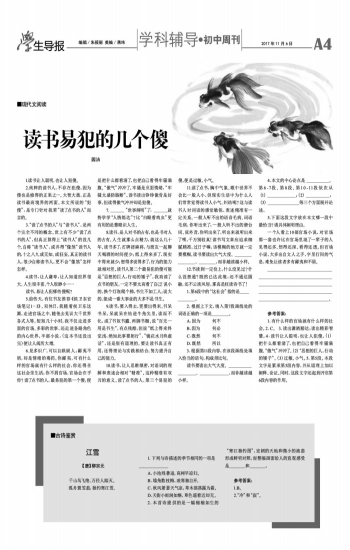 1.读书让人聪明,也让人犯傻。 2.纯粹的读书人,不存在犯傻,因为傻也是修得的正果之一。大智大愚,正是读书最高境界的两面。本文所说的“犯傻”,是专门针对我辈“读了点书的人”而言的。 3.“读了点书的人”与“读书人”,是两个完全不同的概念。世上有不少“读了点书的人”,但真正算得上“读书人”的没几个。自称“读书人”,或弄得“像煞”读书人的,十之八九或无知、或狂妄。真正的读书人,很少自称读书人,更不会“像煞”怎样怎样。 4.读书,让人谦卑,让人知道世界很大、人生很丰富、个人很渺小…… 读书,易让人犯哪些傻呢? 5.前些天,有位书友推荐《侯卫东官场笔记1-3》。双休日,我随着侯卫东这厮,走进官场之中,随他去见识大千世界各式人等。短短几十小时,我不仅走进多面的官场、多彩的世事,还走进各路角色的内心世界。半部小说,(这本书还没出完)便让人阅历大增。 6.见多识广,可以自娱娱人;鄙夷不屑,却是情绪的毒药。你鄙夷,可有什么样的官场就有什么样的社会,你还得在这社会里生活;你不屑官场,官场会在乎你?读了点书的人,最易犯的第一个傻,便是把什么都看清了,也把自己看得牢骚满腹、“傲气”冲冲了。牢骚是负面情绪,“牢骚太盛防肠断”。读书读出铮铮傲骨是好事,但读得傲气冲冲却是犯傻。 7._____________“世事洞明”了,_____________就势学学“人情练达”?比“白眼看鸡虫”更有用的是慧眼识人生。 8.读书,是人对书的占有,也是书对人的占有。人生就那么点精力,就这么几十年。读书多了,打牌搓麻将,与朋友一起聊天喝酒的时间便少;纸上得来多了,现实中得来就少;想得多说得多了,行为的能力就相对差。读书人第二个最易犯的傻可能是“思想的巨人,行动的矮子”。我劝读了点书的朋友,一定不要太高看了自己!说小的,换个灯泡爬个梯,书生不如工人;说大的,能成一番大事业的大多不是书生。 9.读书,要入得去,更要出得来。书呆书呆,呆就呆在钻进牛角尖里,读而不化,成了书奴书蠧、两脚书橱。说“百无一用是书生”,有点残酷,但说“纸上得来终觉浅,绝知此事要躬行”、“镜花水月终虚话”,还是很有道理的。要让读书真正有用,还得理论与实践相结合,努力提升自己的能力。 10.读书,让人思维缜密,对语词的理解和表述会相对“精准”。这种精准有双刃的意义。读了点书的人,第三个易犯的傻,便是过敏、小气。 11.读了点书,胸中气象、眼中世界不会比一般人小,但现实生活中为什么人们常常觉得读书人小气、纠结呢?这与读书人对词语的感觉敏锐、表述精准有一定关系。一般人听不出的语音毛病、词语毛病,你听出来了;一般人听不出的潜台词、弦外音,你听出来了,听出来就听出来了呗,千万别较真!读书写文章应追求细腻精准,过日子嘛,该模糊的地方就一定要模糊。读书要读出大气大度、_____________、_____________,而非越读越小样。 12.书读到一定份上,什么没见过?什么没想通?既然已达此境,还不通达圆融,还不云淡风轻,那真是枉读诗书了! 1.第6段中的“这社会”指的是__________________________。 2.根据上下文,填入第7段画线处的词语正确的一项是_____________。 A.因为 何不 B.因为 何必 C.既然 何不 D.既然 所以 3.根据第11段内容,在该段画线处填入恰当的语句,构成排比句。 读书要读出大气大度、_____________、_____________,而非越读越小样。 4.本文的中心论点是_____________。第6-7段、第8段、第10-11段依次从(1)_____________;(2)_____________;(3)_____________等三个方面展开论述。 5.下面这段文字放在本文哪一段中最恰当?请具体阐明理由。 一个人看上10部官场小说,对官场那一套也许比在官场里混了一辈子的人见得还多、悟得还深、看得还透。但官场小说,大多出自文人之手,字里行间的气息,难免让读者多有鄙夷和不屑。 _________________________________________________________________。 参考答案: 1.有什么样的官场就有什么样的社会。 2.C。 3.读出潇洒豁达;读出精彩智慧。 4.读书让人聪明,也让人犯傻。(1)把什么都看清了,也把自己看得牢骚满腹、“傲气”冲冲了。(2)“思想的巨人,行动的矮子”。(3)过敏、小气。 5.第5段。本段文字是紧承第5段内容,并从道理上加以阐释、论证。同时,这段文字还起到开启第6段内容的作用。