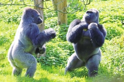 英国德文郡的佩恩顿动物园,两头西部低地大猩猩为争夺食物,正欲进行一场拳击赛。动物园的饲养员们将这场争夺称之为阶级战争。画面中低阶级的猩猩Kivu努力地保护着自己的食物不被中级的大猩猩Kiondo夺走。园内的一名游客拍摄下了这些画面。