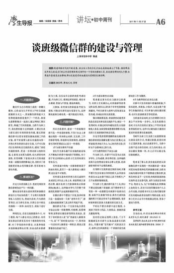 摘要:随着网络时代的不断进展,班主任工作的方式方法也逐渐地跟上了节奏。微信群在近年来已经成为了班主任在管理班级过程中的一个有效的辅助工具。虽说微信群的利大于弊,如果能尽量避免这些弊端,那必定能更有效地建设与管理家长微信群。 关键词:微信群、弊端之处、管理 一、问题提出 微信作为当今网络主流的一种聊天载体,已经成为几乎所有人平时交流最便捷的方式之一。然而微信群的建立又使得便捷的程度提升了一个档次,将原先需要聚集在一起的人通过网络汇聚在群里,跨越了空间的阻隔。当然作为班主任,我也曾经建立过班级群,主要定位是与家长进行有效的家校沟通,通过班级微信群可以更有效更快捷地找到工作的对象,将平时需要与家长沟通的内容一次性向所有的家长进行交流,几乎可以取代以往利用电话交流的形式,提高了家校沟通的效率,更进一步推动家与校的沟通,让家校互动更为紧密。但凡事皆有两面性,有其利弊,下面我从班主任的角度来谈一谈微信群的弊端之处,目的在于希望能更好地去使用微信群,更有效地与家长沟通。 二、弊端何在? 在近几年的实践之中,笔者发现使用微信群难免会产生一些问题: 譬如说有些家长喜欢利用班级微信群进行公司业务的推广、子女照片的集赞等私人化的行为。然而在此时,作为群的管理员,应当事先告知,在群公告中将这些细则一一列举,如有发生,则私下进行交流。 网络发达、信息交流便捷的今天,对于教育,每个人都会有自己的想法,有些家长则会在群里发布对于教育的些许见解,对于学校的些许看法,从某种角度来说的确说得也在理,但是总的来看都较为主观,仅仅站在自家的角度考虑问题。作为班主任,看到这样的消息,着实有点难堪,答复与不答复,都是两难的。 又例如,有些家长的家庭条件较为宽裕,可能会在群里进行炫富行为。这种情况就相当难处理,一般只能进行劝告。 三、问题何解? 所以在我看来,建设一个班级微信群不是一件容易的事情,不同于社会上普遍出现的一些体育运动群、交友群、工作同事群等等,班级群有其特殊性,需要给家长同时更要给自己设立一些准则: 1.作为家长哪些不该做 首先作为家长最不应该做的就是每天不断地在班群中询问孩子的情况,对于孩子有过多的担心,给班主任及其他家长带来压力。 有些家庭中的每一员都想看到孩子的成长变化,甚至于一家人都想进入微信群,这也是不可取的。 有些家长喜欢经常把小孩完成的作业或者艺术作品上传上来,希望得到大家的点赞,最好是班主任能够将焦点转移到他(她)身上。这样做对学生乃至整个班级的发展都不会起到积极的作用。 在微信群中不要急于回复,很多时候只是一条通知却一大堆“老师辛苦了”,那么通知就被刷掉了,真正的作用起不到。 微信群也不是一个交易市场,在群里市场会出现一些集赞啊、代购啊、投票啊等等,使得家长微信群变得鱼龙混杂。甚至于有时候有人说“好”的就有人跟着来一句,说“不”的时候也回应一下,简单的一句话好多人跟着说一样的话,那真正需要看的信息就不见了。 2.作为家长哪些应该做 笔者建议家长们应当做好自我调节,对班主任充满信心,对班级群坚持肯定的态度,相信自己的孩子在学校能够做到最佳。平时在群里与老师与其他家长良性沟通,形成良好的交流氛围。 偶尔晒娃要适度,班级群的功能更多的是信息发布和信息交流的平台。制定一个使用时间,在规定时间外避免使用,以免影响他人休息,如果有特别重要的事情可以私信班主任或者找时间电话交流。 在这里笔者需要提醒的就是最好将微信群的消息提醒设置为免打扰模式,这样就能更多地只关心与己相关的信息,同时也不会影响自己的生活。 3.作为教师我们不该怎么做 作为班主任,在群中不应发布点名批评学生、公布成绩、排名等信息,这样做的结果只会使得部分家长自尊心受损,给班级管理带来不必要的麻烦。 在用照片交流班级近期活动时,尽量不要只发含有部分同学的照片,会导致有些家长永远也看不到自己孩子的照片,产生不必要的情绪低落。 作为班主任,微信群只是个工具,所以不要过度依赖于班级群,切不要将学生日常的一举一动都要发布到群中给家长们看,如果不注意细节的话,某些无意间拍摄的照片可能会带来不必要的麻烦,很多时候和家长面谈才是最佳的交流方式。 平时也不要在班群中进行集资,小到孩子的学习用品,大到奖品、表演的道具服装等等。 没有经过验证的网上消息,千万不能随意发布在群中,以免造成家长们的担心。尽量回避“发号施令”式的说话方式,始终记住班级群是一个班级信息交流群而非工作布置群。 4.作为教师我们应该这么做 在群中只发布班级中普遍的现象,不指名道姓。多表扬,少批评,凡是出现个别学生有偏差的话,可以单独与家长微信联系,也可以直接联系至学校面谈。 当班级有活动时,应当在晒照片时注意公平对待每一名学生。在发布重要信息时,可以在信息的后面加上不用回复或者类似的语句,这样可以避免因大量的回复而导致重要信息被刷屏。 同时作为班主任及群主还需要特别注意说话的方式,传播正能量,给家长树立正面的形象,也以此教育学生。当群中出现不适合的信息时,应当及时指出,但语言最好委婉一些,在之后可以通过私信继续解决。 笔者说了那