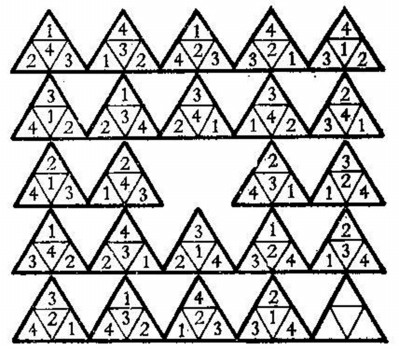 将1、2、3、4四个数字,填在如图的四个小三角形里,可以有24种不同的填法,图中列出了其中23种填法,请想一想,第24种应该怎样填?限时3分钟。