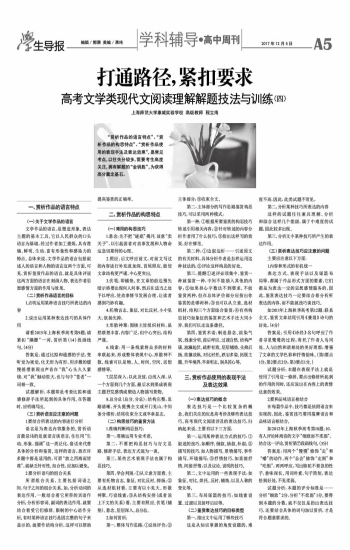 “赏析作品的语言特点”、“赏析作品的构思特点”、“赏析作品使用的表现手法及表达效果”,是常见考点,以往失分较多,需要考生高度关注,拥有解题的“金钥匙”,为获得高分奠定基石。 一、赏析作品的语言特点 (一)关于文学作品的语言 文学作品的语言,是塑造形象、表达主题的基本工具。它以人民群众的口头语言为基础,经过作者加工提炼,具有准确、鲜明、生动,富有形象性和感染力的特点。总体来说,文学作品的语言包括叙述人的语言和人物的语言这两个方面。可见,赏析鉴赏作品的语言,就是具体评说这两方面的语言在刻画人物、表达作者思想感情方面的作用与效果。 (二)赏析作品语言的目标 1.点明运用某种语言技巧所表达的内容 2.说出运用某种表达技巧的具体作用 请看2015年上海秋季高考第9题:请紧扣“蹒跚”一词,赏析第(14)段画线句。(4分) 答案是:通过比拟和通感的手法,变听觉为视觉,化无形为有形,用步履的缓慢摇摆表现出声音在“我”心头久久萦绕,对“我”触动很大,也与句中“苍老”一词相一致。 试题解析:本题即是考查比拟和通感修辞手法所起到的具体作用。在答题时,应明确写出。 (三)赏析语言应注意的问题 1.要结合所表达的内容进行分析 语言是为表达内容服务的。赏析语言最忌讳的是就语言谈语言,往往用“生动、形象、强调”这一类泛化、套话来代替具体的分析和鉴赏。这样的语言,放在许多题中都是适用的,可谓“放之四海而皆准”,就缺乏针对性、扣合性,应加以避免。 2.要分析语句的组合关系 所谓组合关系,主要包括词语之间、句子之间的组合关系。如,分析动词的表达作用,一般结合着它所带的宾语作分析;分析形容词、副词的表达作用,就要结合着受它们修辞、限制的中心语作分析。有时某种语言技巧是因完整的句子来显示的,就要作结构分析,这样可以帮助提高鉴赏的正确率。 二、赏析作品的构思特点 (一)常用的构思技巧 1.悬念:先不把“谜底”揭开,故意“卖关子”,以引起读者对故事发展和人物命运急切期待的心理。 2.照应:后文呼应前文,对前文写过的内容进行补充或加深。首尾照应,能使文章结构更严谨,中心更突出。 3.伏笔:即铺垫。在文章的前边预先暗示将要出现何人何事,然后在适当之处予以呼应,使故事情节发展合理,让读者感到巧妙有趣。 4.托物言志、象征、对比反衬、小中见大、欲扬先抑。 5.形散神聚:围绕主旨组织材料,虽然联想丰富,内容广泛,但中心突出,结构严谨。 6.线索:用一条线索将众多的材料串联起来,形成整体表现中心,形散神不散。线索可以是物、人、时间、空间、思想感情等。 7.层层深入:以此及彼,由浅入深,从一个方面到几个方面,最后水到渠成表现主题抒发感情或塑造人物描写景物。 8.总分总(总分、分总):结构完整,思路清晰,开头提携全文或开门见山,中间条分缕析,结尾收束全文或卒章显志。 (二)构思技巧的鉴赏方法1.准确判断构思技巧: 第一,准确运用专业术语。 第二,不要把构思技巧与行文思路、修辞手法、表达方式混为一谈。 第三,某些艺术表现手法也属于构思技巧。 第四,学会判别:①从立意方面看,主要有托物言志、象征、对比反衬、抑扬;②从选材组材看,主要有以小见大、形散神聚、巧设线索;③从结构安排(或者说上下文的关系)看,主要有照应、伏笔(铺垫)、悬念、层层深入、总分总。 2.如何赏析: 第一,整体写作思路:①总体评价;②主体部分;③收束全文。 第二,主体部分的写作思路鉴赏构思技巧,可以采用两种模式: 第一种:①根据所要鉴赏的构思技巧转述引用相关内容;②针对转述的内容分析作者用了什么技巧;③指出这样写的效果,好在哪里。 第二种:①边叙边析——引述原文的有关材料,具体分析作者是怎样运用这种技法的;②评论这样构思的好处。 第三,提醒①述评必须集中,鉴赏一种就鉴赏一种,中间不能插入其他的内容;②如果担心字数达不到要求,不妨鉴赏两种,但在总体评价部分应指出你鉴赏的是哪两种;③也可以从立意、选材组材、结构三个方面综合鉴赏;④有些构思技巧如象征的鉴赏和艺术手法大同小异,我们可以走这条捷径。 第四,鉴赏术语:制造悬念、渲染气氛、线索分明、前后呼应、过渡自然、结构严谨、波澜起伏、疏密有致、层层铺垫、先抑后扬、欲擒故纵、对比衬托、跌宕多姿、拓展主题、升华境界、卒章明志、别具匠心等。 三、赏析作品使用的表现手法及表达效果 (一)表达技巧的概念 表达技巧是一个比较复杂的概念。我们关注的应是高考涉及哪些表达技巧。高考现代文阅读涉及的表达技巧,归纳起来说,主要有以下三方面: 第一,运用某种表达方式的技巧:①叙述的技巧,如顺序、倒叙、插叙、补叙;②描写的技巧,如人物描写、景物描写、事件描写、环境描写;③抒情技巧,如直接抒情、间接抒情;以及议论、说明的技巧。 第二,文中运用的一些表现手法:如象征、对比、烘托、反衬、铺垫,以及人称的变化等。 第三,布局谋篇的技巧:如线索设置、过渡以及前呼后应等。 (二)鉴赏表达技巧的目标类型第一,指出文中运用了哪些技巧 这是从知识掌握的角度设题的,难度不高,因此,此类试题不常见。 第二,分析某种技巧所表达的内容这样的试题往往兼具理解、分析和综合这样几个能级,属于中难度的试题,因此较多出现。 第三,分析文中某