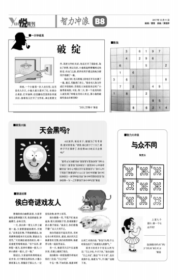 隋朝的侯白幽默诙谐,大家常被他逗得捧腹大笑。他说的谜语,妙趣横生,余味无穷。 一天,侯白和一帮文人学士碰到一起,大家要猜谜助酒兴,并规定:“必须是实物,不得虚解惑众。如果解释清楚却并无此物,那就应当受罚。”只见满肚谜语的侯白,略一思索便笑嘻嘻地说:“有个东西,背和屋一般大,肚和车横轴一般大,口和小酒杯一般大。打一物。” 刚说完,大家就叽叽喳喳地议论开来:天下哪有这种东西,口像小酒杯那么大,背像房子那么大,一定没有此物,侯学士该罚。 侯白微微一笑,不慌不忙地站起身,领大家到院子里,指着屋檐下的小燕子窝说:“就是它,你们看像不像?”众人大笑不已。 侯白用谜语开起玩笑来,有时也令人啼笑皆非。据说,侯白同大臣杨素很有交情。侯白机智善辩,杨素常与他一起说笑逗乐。 有一天,杨素同大臣牛弘退朝回来,在路上碰到了侯白。 侯白眼珠一转便装模作样地对他们二位说:“日之夕矣!” 牛弘一愣,不知何意,杨素却听出来了,对侯白说:“你这个人呀,什么时候也改不了戏谑别人的脾气。” 原来《诗经》中有这么两句话:“日之夕矣,牛羊下来。”侯白说的“日之夕矣”,隐含“牛羊下来”,是在戏称牛弘、杨素为“牛、羊(杨)”退朝下来。