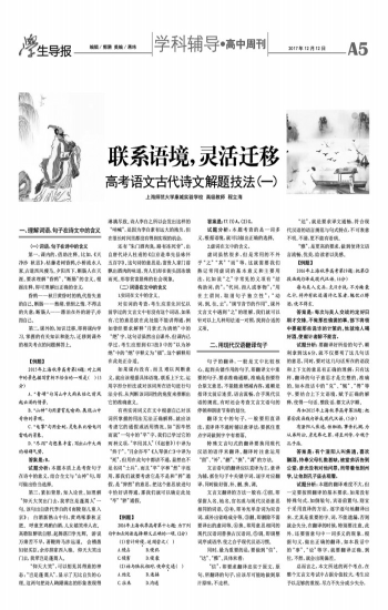 一、理解词语、句子在诗文中的含义 (一)词语、句子在诗中的含义 第一,课内的,借助注释。比如,《天净沙 秋思》:枯藤老树昏鸦,小桥流水人家,古道西风瘦马。夕阳西下,断肠人在天涯。要求理解“昏鸦”、“断肠”的含义。根据注释,即可理解出正确的含义: 昏鸦——秋日黄昏时的鸦,代指失意的自己。断肠——愁绪,悒悒之情,不得志的失意;断肠人——漂泊在外的游子,亦指自己。 第二,课外的,知识迁移。即将课内学习、掌握的有关知识和能力,迁移到课外的相关考点的问题解答上。 【例题】 2015年上海秋季高考第14题:对上阕中的景色描写赏析不恰当的一项是( )(3分) A.“青嶂”句写山中大雨来临之前风起云涌的情景。 B.“山神”句用碧霄龙喻雨,展现山中奇特的景观。 C.“电掣”句用金蛇、灵龟来比喻电闪雷鸣的景象。 D.“尽泻”句想象丰富,写出山中大雨的磅礴气势。 答案是:B。 试题分析:本题本质上是考查句子在诗中的意义,结合全文与“山神”句,即可做出恰当选择。 第三,紧扣背景,知人论世。如理解“仰天大笑出门去,我辈岂是蓬蒿人”一句。该句出自唐代李白的《南陵别儿童入京》: 白酒新熟山中归,黄鸡啄黍秋正肥。 呼童烹鸡酌白酒,儿女嬉笑牵人衣。 高歌取醉欲自慰,起舞落日争光辉。 游说万乘苦不早,著鞭跨马涉远道。 会稽愚妇轻买臣,余亦辞家西入秦。 仰天大笑出门去,我辈岂是蓬蒿人。 “仰天大笑”,可以想见其得意的神态;“岂是蓬蒿人”,显示了无比自负的心理。这两句把诗人踌躇满志的形象表现得 淋漓尽致。诗人李白之所以会发出这样的“呐喊”,是因为李白素有远大的抱负,但在很长时间里都没有得到实现的机会。 还有“朱门酒肉臭,路有冻死骨”,出自唐代诗人杜甫的《自京赴奉先县咏怀五百字》。这句诗的意思是:富贵人家门前飘出酒肉的味道,穷人们却在街头因冻饿而死。形容贫富悬殊的社会现象。 (二)词语在文中的含义 1.实词在文中的含义。 对实词的考查,考生应首先回忆以前学过的文言文中有没有这个词语,如果有,它的意思放在此处能不能讲得通,例如曾经要求解释“月景尤为清绝”中的“绝”字,这句话虽然出自课外,但课内已学过,考生应想到《口技》中的“以为妙绝”中的“绝”字释义为“极”,这个解释用在此处正合适。 如果课内没有,而且难以判断意义,就应该根据具体语境,联系上下文,运用字形分析法或对该词所在语句进行句法分析,从判断该词词性的角度来推断出它的准确意义。 有些实词词义在文中根据自己对该词所掌握的用法无法正确解释,就应该考虑它的通假或活用情况。如“因卒然而就”一句中的“卒”字,我们已学过它的两种义项,“卒用其人”(《赵普》)中译为“终于”,“月余亦卒”《人琴俱亡》中译为“死”,但用在此句中都讲不通,显然也不是名词“士兵”,而且“卒”字和“然”字连用,那我们就要考虑它是不是和“猝”通假,是“猝然”的意思,把这个意思放进句中恰好讲得通,那我们就可以确定此处“卒”“猝”通假。 【例题】 2016年上海秋季高考第十七题:为下列句中加点词语选择释义正确的一项。(2分) (1)皆计所侵,送绢尝之() A.侵占 B.侵犯 C.侵害 D.侵袭 (2)祜与陆抗相对,使命交通() A.结交 B.连接 C.往来 D.沟通 答案是:17.(1)A。(2)C。 试题分析:本题考查的是一词多义,根据语境,就可以做出正确的选择。 2.虚词在文中的含义。 虚词虽然很多,但是常用的不外乎“之”“其”“而”等,这就需要我们熟记常用虚词的基本意义和主要用法,比如说“之”字常见的义项有“结构助词,的”;“代词,指人或事物”;“用在主谓间,取消句子独立性”;“动词,到、往、去”;“调节音节的作用”。课外文言文中遇到“之”的理解,我们就可以针对以上几种用法逐一对照,找到合适的义项。 二、用现代汉语翻译句子 句子的翻译,一般是文中比较核心、起到关键作用的句子。即翻译文中重要的句子,要求准确通顺。准确是指要符合原文意思,不能随意增减内容;通顺是指译文前后连贯,语言流畅,合乎现代汉语的规范。有时还会考查文言文语句的停顿和朗读节奏的划分。 翻译文中的句子,一般要用直译法。直译译不通时辅以意译法,要抓住重点字词做到字字有着落。 特殊文言句式的翻译要换用现代汉语的语序来翻译。翻译时注意运用“留”、“补”、“删”、“换”、“调”的方法。 文言语句的翻译应以直译为主,意译为辅,抓住句子中关键字词,逐字对应翻译,同时做好留、补、删、换、调。 文言文翻译的方法一般有:①留。即保留人名、地名、官名或与现代汉语意思相同的词语。②补。即补充单音词为双音词,或补出省略成分等。③删。即删除不需要译出的虚词等。④换。即用意思相同的现代汉语词替换古汉语词。⑤调。即调整词序或语序,使之合乎现代汉语习惯。 同时,最为重要的是,要做到“信”、“达”、“雅”。具体来看: “信”,即要求翻译忠实于原文、原句,所翻译的句子,应该尽可能地做到原汁原味,不走样。 “达”,就是要求译文通畅,符合现代汉语的语言规范与句式特点,不可表意不明、不清,更不能有语病。 “雅”,是更高的要求,做到使译文语言流畅、优美,给读者以美感。 【例题】 2016年上海秋季高考第19题:把第③段画线句译成现代汉语。(6分) 每与吴人交兵,克日方战,不