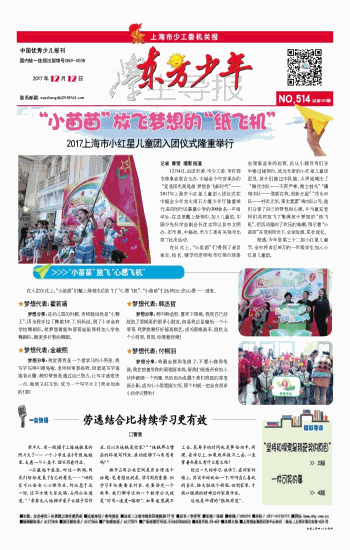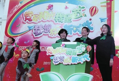 12月4日,由团市委、市少工委、市红领巾理事会联合主办,中福会少年宫承办的“党是阳光我是苗 梦想放飞新时代”——2017年上海市小红星儿童团入团仪式在中福会少年宫大理石大厦少年厅隆重举行,来自闵行区蔷薇小学的300余名一年级学生,在这里戴上绿领巾,加入儿童团。中国少先队学会副会长沈功玲以及市文明办、团市委、中福会、市少工委有关领导出席了此次活动。 在仪式上,“小苗苗”们得到了来自家长、校长、辅导员老师和市红领巾理事会理事送来的祝贺,还从小辅导员们手中接过绿领巾,成为光荣的小红星儿童团团员,孩子们接过中队旗,大声地喊出了“梅花中队——不畏严寒,傲立枝头”“薄荷中队——清新在我,创新无敌”“花生中队——朴实无华,果实累累”等中队口号。他们分享了自己的梦想和心愿,并与嘉宾老师们共同放飞了集满孩子梦想的“纸飞机”,把活动推向了欢乐的高潮,预示着“小苗苗”在党的阳光下,全面发展,茁壮成长。 据悉,今年是第三十二届小红星儿童节,全市将有近16万的一年级学生加入小红星儿童团。 >>>“小苗苗”放飞“心愿飞机” 在入团仪式上,“小苗苗”们戴上绿领巾后放飞了“心愿飞机”,“小苗苗”们还将自己的心愿一一道来。 ★梦想代表:翟若涵 梦想分享:在幼儿园的时候,老师就说我是“小舞王”,因为我学拉丁舞都3年了,妈妈说,到了小学会有学校舞蹈队,我梦想着能和哥哥姐姐那样加入学校舞蹈队,跳更多好看的舞蹈。 ★梦想代表:金峻熙 梦想分享:我觉得我是一个爱学习的小男孩。我写字写得可漂亮啦,老师经常表扬我,但就是写字速度有点慢,我的梦想是通过自己努力,让写字速度快一点,做到又好又快,成为一个写字大王!我会加油的!耶! ★梦想代表:韩丞哲 梦想分享:我叫韩丞哲,喜欢下围棋,我现在已经战胜了围棋班的很多小朋友,但是我总是输给一个小哥哥,我梦想着好好提高棋艺,成为围棋高手,战胜这个小哥哥。哥哥,你等着我哦! ★梦想代表:付桐羽 梦想分享:我最会画简笔画了,不要小瞧简笔画,我在想着用我的简笔画本领,帮我们班级所有的小伙伴都画一个肖像,然后组合成属于我们班级的简笔画合影,成为小小简笔画大师。那个时候一定会有很多小伙伴点赞的!