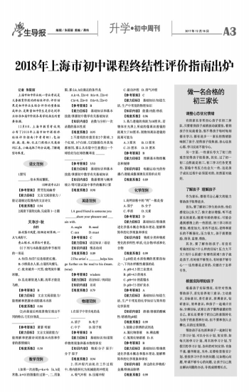 上海市初中毕业统一学业考试是义务教育阶段的终结性评价,评价结果是初中毕业生综合评价的重要组成部分,是衡量初中学生是否达到毕业标准和高中阶段各类学校招生的重要依据。 1 2月8日,上海市教育考试院公布了2018年上海市初中课程终结性评价指南(中考考纲),包括语、数、英、物、化五门课程以及英语词汇表。小编选取了部分试题,了解题型与难度。 语文范例 1.默写 ____________,佳木秀而繁阴。 (《醉翁亭记》) 【参考答案】 野芳发而幽香 【能力目标】 文言文阅读能力 / 能记诵规定范围内的文言诗文 【难度系数】 0.94 2.阅读下面的元曲,完成第 1—2 题 天净沙·秋 白朴 孤村落日残霞,轻烟老树寒鸦,一点飞鸿影下。 青山绿水,白草红叶黄花。 (1)下列与本曲描述的季节相同的一项是 A.知否,知否?应是绿肥红瘦。 B.小桥流水人家,古道西风瘦马。 C.夜来城外一尺雪,晓驾炭车辗冰辙。 D.乱花渐欲迷人眼,浅草才能没马蹄。 【参考答案】 B 【能力目标】 文言文阅读能力/能理解和把握诗词的基本内容 【难度系数】 0.86 (2)本曲前后两组景物呈现出不同的特点,它们分别是_____________。 【参考答案】 萧瑟 明丽 【能力目标】 文言文阅读能力/能理解和把握诗词的基本内容和作者的感情倾向 【难度系数】 0.50 数学范例 1.如果一次函数y=kx+b (k、b是常数,k≠0)的图像经过第一、二、四象限,那么k、b应满足的条件是 A.k>0,且b>0 B.k<0,且b>0 C.k>0,且b<0 D.k<0,且b<0 【参考答案】 B 【能力目标】 基础知识和基本技能/掌握初中数学有关基础知识 【知识内容】 函数与分析/一次函数的基本性质 【难度系数】 0.95 2.不透明的布袋里有2个黄球、3个红球、5个白球,它们除颜色外其他都相同,那么从布袋中任意摸出一个球恰好为红球的概率是______________。 【参考答案】 3/10 【能力目标】 基础知识和基本技能/掌握初中数学有关基础知识 【知识内容】 数据整理与概率统计/等可能试验中事件的概率计算 【难度系数】 0.98 英语范例 1.A good friend is someone you ______ share your pleasure and ______ ain with. A.ought B.need C.can D.must 【参考答案】 C 【能力目标】 语言知识 / 语法 【知识内容】 情态动词 【难度系数】 0.89 2.The artist’s ______ helps him go further on the road to his dream. (wise) 【参考答案】 wisdom 【能力目标】 语言知识 / 构词法 【知识内容】 名词 【难度系数】 0.79 物理范例 1.在原子中带负电的是 _______ A.质子 B.电子 C.中子 D.原子核 【参考答案】 B 【能力目标】 基础知识/知道简单物理现象和基本物理事实 【知识内容】 物质/分子 原子/分子 原子 【难度系数】 0.94 2.四冲程汽油机在工作过程中,将内能转化为机械能的冲程是 A.吸气冲程 B.压缩冲程 C.做功冲程 D.排气冲程 【参考答案】 C 【能力目标】 基础知识/知道生活、生产中常见的物理知识 【知识内容】 能量/内能/热机 【难度系数】 0.96 3.某凸透镜的焦距为10厘米,若物体在光屏上所成的像离该透镜的距离大于30厘米,则物体离该透镜的距离可能为 A.3 厘米 B.13 厘米 C.23 厘米 D.33 厘米 【参考答案】 B 【能力目标】 理解基本物理概念和规律 【知识内容】 电磁运动/光的传播/凸透镜成像规律及其简单应用 【难度系数】 0.89 化学范例 1.高钙奶粉中的“钙”一般是指 A.原子 B.分子 C.单质 D.元素 【参考答案】 D 【能力目标】 基础知识/准确表述化学基本概念和基本理论,能解释简单的化学现象和事实 【知识内容】 物质分类和物质变化的多样性/单质、化合物/单质和化合物 【难度系数】 0.99 2.pH值是水质检测的重要指标之一,下列水样酸性最强的是 A.pH=1.3 的工业废水 B.pH=4.5 的雨水 C.pH=7.0 的蒸馏水 D.pH=7.3 的矿泉水 【参考答案】 A 【能力目标】 基础知识/知道生活、生产中常见的化学知识与简单的化学原理 【知识内容】 溶液/溶液的酸碱性/溶液的pH值 【难度系数】 0.99 3.能除去铁锈的试剂是 A.氯化钠溶液 B.稀盐酸 C.氢氧化钠溶液 D.水 【参考答案】 B 【能力目标】 基础知识/准确表述化学基本概念和基本理论,能解释简单的化学现象和事实 【知识内容】 身边的化学物质/金属/铁制品除锈 【难度系数】 0.99