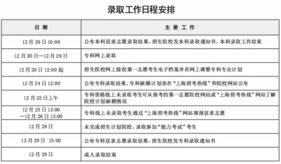 2017年上海市成人高校招生录取工作于12月11日至12月29日进行。录取将分三个层次进行:高中起点升本科、专科起点升本科和高中起点升专科。考生可根据招生录取进程,了解征求志愿及录取结果查询等信息。
