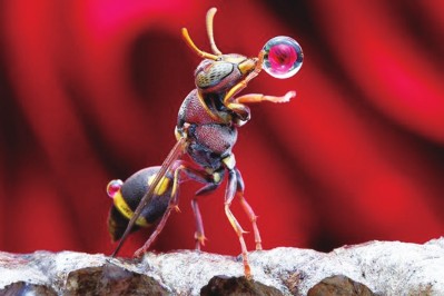 近日,一张胡蜂吸吮水珠,并用前足保持平衡的图片吸引了许多网友的关注。乍看之下,这只胡蜂似乎正在“吹泡泡”,而它吹出的水珠恰好映照出一朵玫瑰花,充满了美感。 科学家对这种奇特的现象做出了解释。据观察,有好几种“勤勉”的昆虫有用口器悬挂水珠的现象。事实上,它们是在采集巢穴中过多的水汽,然后慢慢汇集成一个个小水珠排出去。这一过程会使它们看起来就像是在“吹泡泡”。 今年早些时候,摄影师Lim Choo How在马来西亚吉打州一家工厂附近散步时,拍摄到了这些胡蜂忙于吸水,“吹泡泡”的画面。其实,它们是在保持蜂巢的干燥。当水珠足够大时,它们就会用前足把水珠揩掉。Lim Choo How还拍摄了一群胡蜂在一段垂直蜂巢上一起工作的场景。 美国自然历史博物馆的管理者、昆虫学家詹姆斯·卡彭特(James Carpenter)说,在蜂类中,这种运输水珠的现象十分常见,尤其是那些生活在热带、潮湿地区的种类。“这些蜂会舔舐水分,然后排走。”卡彭特说道。他的研究领域是社会性蜂类的演化关系和行为。 美国卡耐基自然历史博物馆Powdermill自然保护区主管约翰·温策尔(John Wenzel)称,通过吸吮蜂巢表面的水分,胡蜂可以保持蜂巢的精细结构不至湿透并瓦解。“这是一种使纸质蜂巢保持干燥的机制,”温策尔说,“在建造过程中,许多物种会吐唾液在蜂巢上,干燥变硬之后就成了一种丝状表面,有防水的作用。这些方法是很有必要的,因为许多物种的蜂巢是纸质的,干燥时坚固,但潮湿时就会瓦解。因此,考虑到幼虫和卵的重量,如果它们什么都不做的话,一旦被水沾湿,蜂巢就有可能崩溃。”