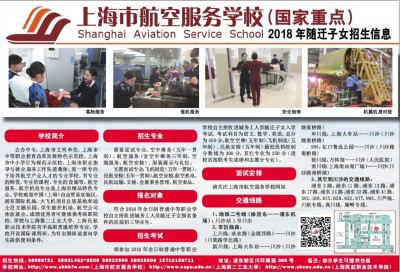 学校简介 公办中专,上海市文明单位,上海市中等职业教育改革发展特色示范校,上海市中小学行为规范示范校,上海市职业指导与就业服务工作先进集体,是一所专注于培养航空产业人才的专业学校。有专业的师资,专业的课程,专业的设施等。航空服务、航空机电专业是上海市精品特色专业。学校毗邻中国(上海)自由贸易实验区、浦东国际机场、大飞机项目总装基地和迪士尼主题乐园。学生能在机场、航空公司体面就业,成绩优秀者可继续报考高职院校,学校与上海第二工业大学、上海民航职业技术学院有中高职贯通培养专业。学校开设国际课程班,为有出国深造意向学生提供便利条件。 招生专业 需要面试专业:空中乘务(五年一贯制)、航空服务(含空中乘务三年制、空港服务、航空安检)、服装展示与礼仪。 无需面试专业:飞机制造(五年一贯制)、民航安检(五年一贯制)、航空安检、航空机电、民航运输、文秘、会展事务管理、航空食品。 报名对象 符合2018年全日制普通中等职业学校自主招收进城务工人员随迁子女报名条件的应届初三毕业生。 招生考试 须参加2018年全日制普通中等职业学校自主招收进城务工人员随迁子女入学考试,考试科目为语文、数学、英语,总分为450分。航空空乘(五年制)、飞机制造(五年制)、民航安检(五年制)最低投档控制分数线为300分,其它专业为250分(进校后按照考生成绩和志愿分专业)。 面试安排 请关注上海市航空服务学校网站 交通线路 1、地铁二号线(徐泾东——浦东机场):川沙站1号口出 2、市区线路: 上川线:淡水路(金陵西路)——川沙(川黄路学北路) 新川线:上海火车站——川沙(川沙路南桥路) 申川线:上海火车站——川沙(川沙路南桥路) 991:虹口鲁迅公园——川沙(川沙路南桥路) 徐川线:万体馆——川沙(人民医院)南川线(上海南站南广场)——川沙(川沙路南桥路) 3、其它到川沙的交通线路: 浦东3路、浦东11路、浦东13路、浦东17路、浦东24路、浦东32路、浦东41路、182、188、615、628、632、977、993、川芦线、川航专线、高川线、施崂专线。 招生热线:58989721 58921462*8508 58922996 58925906 15710156711 地址:浦东新区川环南路266号 备注:部分学生可提供住宿 学校网址:http://www.shhkfw.com(上海市航空服务学校) http://www.sspu.edu.cn(上海第二工业大学) http://www.shcac.edu.cn(上海民航职业技术学院)