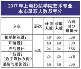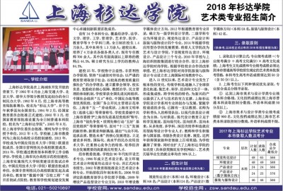 一、学校介绍 上海杉达学院是在上海浦东开发开放的背景下,于1992年6月由上海交通大学、北京大学、清华大学部分教授发起创办的全日制民办大学。1992年8月,经上海市高等教育局批准筹办,校名为“杉达大学”,并于当年秋季面向全国招生;1994年2月,经国家教育委员会批准正式建校;2002年3月,经国家教育部批准设置为全日制普通本科院校,校名为“上海杉达学院”;2005年8月,经上海市学位委员会批准,增列为学士学位授予单位。2012年4月,学校被上海市教委列为上海民办高校示范校创建校。2013年,学校成为中国应用技术大学(学院)联盟首批成员、全国非营利性民办高校联盟成员。2014年,学校通过教育部本科教学工作合格评估。学校是上海市民办高校示范校创建校、上海市实施现代大学制度建设首批试点单位;中国应用技术大学(学院)联盟首批成员单位、全国非营利性民办高校联盟发起及成员单位;教育部“数据中国‘百校工程’”项目首批试点院校;教育部学校规划建设发展中心卓越创新联盟首批成员。 设有34个本科专业,覆盖经济学、法学、文学、理学、工学、管理学、艺术学、医学、教育学等9个学科门类。全日制在校生1.4万余人,其中本科生1.3万余人;建校以来,培养了4万余名各级各类人才。现有专任教师700余人,其中具有副高级以上职称的教师占44.5%,硕士研究生以上学历的教师占84.5%。 建校25年,学校恪守公益性、非营利性办学原则,坚持“以诚信对待社会,以严谨的教育管理取信于社会,以较高的教育质量回报社会”的办学理念,建立董事会领导、校长负责、党委政治核心保障、教授治学、民主管理的体制机制。学校荣获全国先进民间组织、中国社会组织“五A”单位、中国民办高等教育优秀院校、全国厂务公开民主管理示范单位、上海市“五一”劳动奖状、上海市文明单位(连续七届)等荣誉称号。学校党委被中共上海市委授予“上海市先进基层党组织”称号、上海市“创先争优•世博先锋行动‘五好’基层党组织”等荣誉称号。面对“十三五”发展的新形势、新需求和新挑战,提出“与众不同,追求品质,塑造未来”的核心发展理念,立足建设多科性、国际化、高水平的民办应用技术大学,注重核心竞争力的培育,培养经济社会发展需要的高素质应用型人才。 经市教委批准,学校自90年代初开设艺术专业,1996年成立艺术设计系,设立环境艺术设计和视觉传达设计专业,并正式向本市招生;2002年教育部批准设立艺术设计本科专业,开始招收四年制本科生;2006年经评定获准教育部学士学位授予资格。2009年增设产品造型设计专业方向,2010年增设数字媒体设计方向。2012年根据教育部专业目录,确立为一级学科设计学类,二级学科专业为环境设计、视觉传达设计、产品设计和服装与服饰设计四个专业。2014年根据学校应用型办学的发展需要,将原人文学院改为艺术与设计学院,下设视觉传达设计、环境设计、产品设计三个专业。2010年学校与上海纺织控股集团进行校企合作,设立上海杉达学院时尚学院。根据学校校企合作的改革举措,把上海杉达学院时尚学院服装与服饰设计专业设立在上海国际时尚教育中心。 进入21世纪以来,艺术设计专业发生了根本性的变化,传统学科迅速融入了全球信息化轨道,集艺术、科学、经济和文化于一体,形成集成性、跨学科性的特色,为新兴的产业提供了人才与技术的有力支撑。上海杉达学院设计学系列专业的创办与发展,紧随学校前进的步伐,已拥有一支以教授、名师为学科带头人的师资队伍, 以现代信息设计理念为主体,与时俱进。现代设计教育立足于科学发展观,面向现代化、面向世界、面向未来;从多角度、多学科、深层次培养和造就应用型高等设计学专业人才。教师和学生积极参与国家级、市级各类设计竞赛、展览,近两年获得国家级和省部级上百项奖励,为学校赢得了荣誉,同时也扩大了上海杉达学院的知名度(具体获奖情况见学校网站)。艺术类历届毕业生的就业率均在98%以上。 二、招生计划 (以2018年普通高校招生专业目录公布为准) 视觉传达设计(本科)48名;环境设计(本科)48名;产品设计(本科)24名;产品设计(数字媒体方向)(本科)24名;服装与服饰设计(本科)42名。 三、录取原则 (供参考,以本校正式公布的2018年招生章程为准) 1.录取总分计算公式:专业统考成绩+(专业统考满分÷高考文化满分)×高考文化成绩;上海考生文化成绩和专业统考成绩必须达到本市普通高等学校招生规定的艺术类本批报考资格,本科考生高考外语成绩须达到50分(含50分)以上。 2.上海考生以下两种情况优先录取,专业按合成总分排序录取。 ① 达到上海市美术与设计学类专业统考本科合格线、文化投档成绩达到上海市普通本科录取控制分数线、外语单科成绩50分及以上。 ② 上海市美术与设计学类专业统考成绩前900名,文化投档成绩达到上海市艺术类本科录取控制分数线,外语单科成绩不限。 电话:021-50210897 学校官网:www.sandau.edu.cn 学校招生网: zsw.sandau.edu.cn
