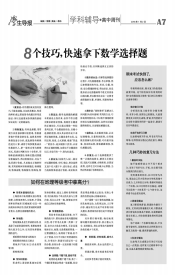 ◆ 背课本基础知识点: 上海的高中地理模块划分得很清楚:自然地理和人文地理,中国地理和世界地理(区域地理)以及一些拓展知识和应用,因此背诵的时候要有重点,也要注意解题的模式。 ◆ 背地图: 背地图虽是老生常谈的内容,但是除了知道背诵经纬网、重要地理事物大致方位之外,还有其他掌握地图的技巧: 看重要经纬线穿过的地方看重要经纬线交叉的点 看地形(气候/水文/农业类型等)图 看特殊区域 ◆ 背知识模板: 即老师上课讲的基础知识框架体系模板:通过上课时老师的梳理,明白地理各个单元的关系与主要内容,再自己去串一遍,能够逐步形成自己的知识检索网络。 ◆ 背答题模板: 即高考经典真题及答案:在不断的练习中,要有意地寻找考题的倾向性,卷子常考点是哪一类哪一方面,拉分点大致是在哪里。无论是基础知识点、地图,还是模板的背诵,一定要提醒自己:地理始于背诵,但不止于背诵,万万不可陷于死背诵的坑里。在考试中,背诵可以保证有一定的分数,但高分者一定是来源于对题目和材料的分析。 ◆ 选择题:千题千面,基础不变 地理的选择题千题千面,换了一个题目背景就会变成一道新题。但切莫觉得选择题太过复杂,实际上考查的仍然是核心的基础知识。 对于需要一定计算的选择题,如涉及地球运动、太阳视运动、人口等内容,最好的方法是平时多练习相关题目,熟悉相同内容但是不同角度的问法。 另外要仔细审题,确切地理解问题所提问的内容,防止粗心失分。而排除法、类比法等技巧能够帮助我们减少干扰项。 ◆ 简答题:材料地图,重中之重 细致读材料,是永远的重中之重。 答题步骤,贵在检索和思考周全。 反思参考答案才能有所提升。