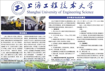 学校概况 上海工程技术大学是工程技术、经济管理和艺术设计等多学科互相渗透、协调发展的全日制普通高等学校。学校设有松江、长宁、虹口等校区,其中松江校区是主校区,位于上海市龙腾路333号。主校区坐落于上海松江大学城,占地近1400亩,总建筑面积48万平方米。一座现代化、信息化、人文化、园林化的美丽校园矗立在黄浦江上游,镶嵌在佘山之侧,为师生员工提供了良好的教学、科研、学习和生活环境。 学校作为国家教育部“卓越工程师教育培养计划”首批试点高校之一,不断深化教育教学改革,创新人才培养模式,提高教育质量。学校坚持依托现代产业办学,服务经济社会发展的办学宗旨,坚持现代化工程应用型特色大学的办学定位,以现代产业发展需求为导向,学科群、专业群对接产业链和技术链,以产学研战略联盟为平台,以实践能力和创新能力培养为核心,构筑与行业企业协同育人、协同办学、协同创新的 “三协同模式”,形成了特色鲜明的办学模式和人才培养模式,培养高等工程应用型人才,成为优秀工程师和工程服务人才的摇篮。 空中乘务专业招生概况 2018年我校空中乘务专业继续参加上海市专科层次依法自主招生,由于国家民航局对空勤人员有特殊要求,故考生须提前参加由学校组织的形象面试和体检,具体办法如下: 一、报考条件 1、符合2018年上海市专科层次依法自主招生报名资格的考生。 2、女生身高162cm~172cm,男生身高173cm~185cm。 3、单眼矫正视力均不低于C字视力表0.5;眼球大小适中,对称,目光有神,无色盲。 4、五官端正,肤色好,裸露部位无明显疤痕、斑点等,无纹身。 5、牙齿排列整齐,无明显异色;无狐臭,无口吃、舌短现象,听力正常。 6、无精神病史,肝功能正常,无各类慢性疾病。7、形体匀称、步态自如、动作协调,无“X”形腿、“O”形腿。 二、形象面试和体检时间、地点及内容时间:2018年1月21日(周日)、2018年3月4日(周日)上午9:00—下午14:30(两场形象面试参加一场即可) 地点:上海工程技术大学长宁校区(长宁区仙霞路350号)。 内容: 1、身体初检 2、形象面试(气质形象,对话交流,现场展示) 3、正式体检:经身体初检和形象面试合格的考生,须按照中国民用航空总局颁布的CCAR67FS乘务员体格检查标准进行专业体检。(体检费自理) 三、注意事项 1、形象面试环节请注意着装整洁、轻便,请不要化妆。 2、报名当天请携带本人身份证、一寸报名照1张,黑色水笔1支。 3、形象面试和体检合格者,方可报考我校专科层次依法自主招生空中乘务专业,准予报考名单将会在我校本专科招生网上公布,请及时关注。 联系电话: 021-62750183 招生网站: zsb.sues.edu.cn