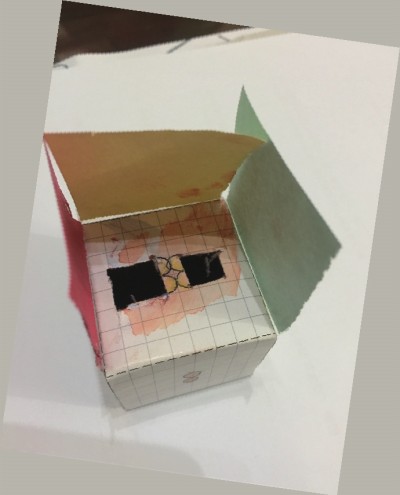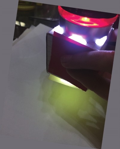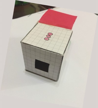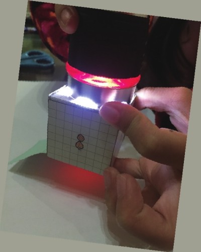 实验材料:白纸、红纸、黄纸、蓝纸各一张;一把美工刀;一个手电筒。 实验过程:1.白纸折叠成一个正方体空心纸盒子;2.在空心纸盒子任意相对的A、B面上挖一大一小两个洞;3.红、黄、蓝纸各贴在正方体小洞的那一面,只贴一个边。让有色纸片可以自由翻动;4.手电筒从A面大洞射光进去,观察B面是红、黄、蓝纸片时透射在白纸上的光线颜色;5.重叠红+黄、黄+蓝、红+蓝纸片,观察透射在白纸上光线颜色的变化。 实验原理:红色玻璃(或玻璃纸)只能透过红光,蓝色玻璃(或玻璃纸)只能透过蓝光,黄色玻璃(或玻璃纸)只能透过黄光。上述实验表明,白光照射到有色透明物体上时,被有色透明物体透过的是与物体相同颜色的光,其他颜色的光都被吸收了。