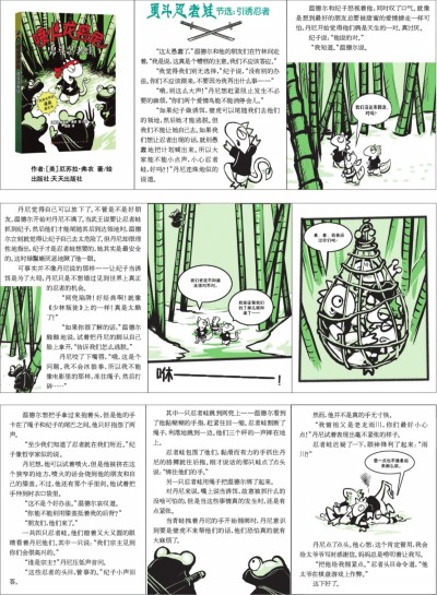 作者:[美]厄苏拉·弗农 著/绘 出版社:天天出版社 “这太愚蠢了,”温德尔和他的朋友们在竹林间走着,“我是说,这真是个糟糕的主意。我们不应该答应。” “我觉得我们别无选择,”纪子说,“没有别的办法。你们不应该跟来,不要因为我再出什么事——” “哦,别这么大声!”丹尼想赶紧阻止发生不必要的麻烦,“你们两个爱情鸟能不能消停会儿。” “如果纪子做诱饵,壁虎可以尾随我们去他们的领地,然后她才能逃脱。但我们不能让她自己去。如果我们想让忍者出现的话,就别愚蠢地把计划喊出来。所以大家能不能小点声,小心忍者蛙,好吗?!”丹尼连珠炮似的说道。 温德尔和纪子怒视着他,同时叹了口气。就像是想到最好的朋友总要被甜蜜的爱情掳走一样可怕,丹尼开始觉得他们俩是天生的一对。真讨厌。 纪子说:“他说的对。” “我知道。”温德尔说。 丹尼觉得自己可以放下了。不管是不是好朋友,温德尔开始对丹尼不满了。当武王说要让忍者蛙抓到纪子,然后他们才能尾随其后到达领地时,温德尔立刻就觉得让纪子自己去太危险了。但丹尼却很理性地指出,纪子才是忍者蛙想要的,她其实是最安全的。这时绿鬣蜥厌恶地瞅了他一眼。 可事实并不像丹尼说的那样——让纪子当诱饵是为了大局,丹尼只是不想错过见到世界上真正的忍者的机会。 “网兜陷阱!好经典啊!就像《少林叛徒》上的一样!真是太酷了!” “如果你很了解的话,”温德尔酸酸地说,试着把丹尼的脚从自己脸上拿开,“告诉我们怎么逃脱。” 丹尼咬了下嘴唇,“哦,这是个问题。我不会冰狼拳,所以我不能像电影里的那样,冻住绳子,然后打碎……” 温德尔想把手拿过来抱着头,但是他的手卡在了绳子和纪子的尾巴之间。他只好抱怨了两声。 “至少我们知道了忍者就在我们附近。”纪子像哲学家似的说。 丹尼想,他可以试着喷火,但是他被挤在这个狭窄的地方,喷火的话会烧到他的朋友和自己的膝盖。不过,他还有那个手里剑。他试着把手伸到衬衣口袋里。 “这不是个好办法。”温德尔哀叹道。 “你能不能别用膝盖抵着我的后背?” “朋友们,他们来了。” 一共四只忍者蛙。他们瞪着又大又圆的眼睛看着丹尼他们。其中一只说:“我们宗主见到你们会很高兴的。” “谁是宗主?”丹尼压低声音问。 “这些忍者的头目,管事的。”纪子小声回答。 其中一只忍者蛙跳到网兜上——温德尔看到了他黏糊糊的手指,赶紧往回一缩。忍者蛙割断了绳子,利落地跳到一边。他们三个砰的一声摔在地上。 忍者蛙包围了他们,黏滑而有力的手抓住丹尼的胳膊就往后拖。刚才说话的那只蛙点了点头说:“绑住他们的手。” 另一只忍者蛙用绳子把温德尔绑了起来。 对丹尼来说,嘴上说当诱饵,故意被抓什么的没啥可怕的,但是当这些事情真的发生时,还是有点紧张。 当青蛙拽着丹尼的手开始捆绑时,丹尼意识到要是壁虎不来帮他们的话,他们恐怕真的就有大麻烦了。 然而,他并不是真的手无寸铁。 “我曾祖父是老龙雨川,你们最好小心点!”丹尼试着表现出毫不紧张的样子。 忍者蛙迟疑了一下,眼神锋利了起来:“雨川?” 丹尼点了点头。他心想:这个肯定管用,我会给太爷爷写封感谢信。妈妈总是唠叨着让我写。 “把他给我捆紧点。”忍者头目命令道,“他太爷在棋盘游戏上作弊。” 这下好了。