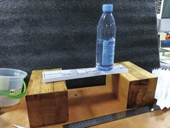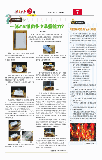 薄薄一张A4纸只有几克,制作成的桥却能承重一瓶500ml的矿泉水!这是怎么做到的呢?这一次我们就来看看这张纸是怎么样一点点“蜕变”成坚硬的小桥。 我们只需要准备一张纸,另外还有两个木块作为桥墩。 首先我们给自己定一个小目标,在相距20cm的情况下,看看纸有多大的承重能力。 我们先看看一张纸在不经过任何处理的情况下,能承重多少呢? 显然这张纸非常的“软弱”,就连一个轻轻的塑料杯都支撑不住。怎样做可以让它变得坚硬呢?接下来就是见证“奇迹”一步步地出现。 我们尝试下将纸对折一次后,会不会增强它的“力量”。 从上面的照片中看出,对折一次后的纸似乎“强壮”了一些,能支撑住刚刚的塑料杯了,不过它距离我们的目标有很遥远的距离呢!但是这一次的对折给了我们很多的启发,是不是再多折叠几次就会让A4纸更加的“强壮”呢?我们来看看实验的情况: 在折叠2次之后,我们将纸折叠了一个“凹”字形,轻而易举地支撑了一个空的杯子,我们在其中放上了5颗玻璃弹珠,似乎也是稳稳当当!看来,我们的设想是正确的! 接着我们继续折叠,将“凹”字形的左右两边分别向内折叠一次,变成下图的样子。 原来左右两侧竖直的边,被折成了两个三角形。之后再次进行承重。这一次,不仅承重了一个塑料饼干罐子,还有14颗弹珠。 有了这样的两次实验,忽然有了这样一个猜想,“折得越多,承重越强。”同时也产生了一个大胆的挑战,我们要承重一瓶装满的矿泉水!为此,我就用一张新的A4纸,折成了波浪状。(见图8) 经过几次的尝试,我们的A4纸竟然成功地支撑起了一瓶装满的500ml矿泉水!仅仅简单几次的折叠,“柔弱”的A4纸就变得十分的“坚硬”。不过在这次的挑战中,矿泉水瓶放上去的过程跌跌撞撞,几次的尝试中只有一次将我们的矿泉水瓶放稳。该如何改进,才能让矿泉水瓶稳稳地站立在“纸桥”上呢? 我们先将A4纸沿着长边,剪成较宽和较窄的两个部分,将较宽的部分折成波浪形,将较窄的部分沿着长边对折。然后把波浪桥架在桥墩上,再将对折后的纸平铺在桥上做成桥面,再一次将矿泉水瓶放上纸桥,这一次的实验真是“十拿九稳”。每一次都是稳稳当当站立在桥上。 到这里,我们的实验也算大功告成。一张只有4.5克重的A4纸架设的桥梁,竟然承受住了500ml重的矿泉水瓶。同学们,如果是你们,会不会有更好的办法,让横跨20cm的桥梁再承受一瓶矿泉水的重量呢? 用2张A4纸在距离20cm的木块上架设纸桥,是否能承受2瓶矿泉水的重量。用2张A4纸在距离30cm的木块上架设纸桥,是否能承受1瓶矿泉水的重量。 欢迎同学们踊跃尝试,将你们的方案分享给我们,我们会将优秀的方法刊登。 投稿邮箱:dishtech@126.com