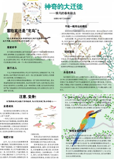 出版社:电子工业出版社 冒险家还是“宅鸟”? 飞去天涯海角还是永驻自家枝头?每只鸟都要回答这个问题,而它们的观点不尽相同…… 居家好手 在可爱的灰林鸮看来,离开自家地盘是绝对不可能的事情!即使寒风刺骨、食物稀缺,它也总能找到一只冒失的田鼠,并将其一口吞下。 住在松树林的冠山雀也是“宅鸟”之一。除了在树皮里找寻昆虫和幼虫,它也爱吃浆果。和它一样,啄木鸟也是全年执着地待在同一个地方。它们总能通过在树皮上啄一个小洞,在里面找到幼虫来吃。 旅行达人 不过,毕竟食物是有限的,所以并不是所有鸟儿都能驻留下来。于是很多鸟儿每年要进行两次旅行。秋天一到,它们就启程飞往南方;待到春回大地的时候,它们便重返北方。 白鹳、欧亚红尾鸲或者短趾雕就会一直飞到非洲的热带地区。苍头燕雀则逗留在地中海周边国家。当这些鸟向南飞去时,也有其他鸟从更北的地方前来拜访,比如黑雁。这是一种体型较小的雁,它们告别西伯利亚的严寒,飞到法国的大西洋沿岸品尝海草的味道。待冬去春回之时,它们又启程飞回北极。 不能一概而论的情况 某些种类的鸟进行部分迁徙,即它们当中的一部分会迁徙远行,而其余的鸟则留守原地。如北欧一带的知更鸟(学名:欧亚鸲)会飞到欧洲南部过冬;而法国土生土长的知更鸟则全年都待在自家院子里。 也有如苍鹭一样,幼鸟远行而父辈留守的情况。再如在冰岛繁衍的雷鸟,当它们越冬时,雄性雷鸟会留在海拔较高的凉爽环境中,而雌性雷鸟则飞到较为温暖的山谷里。 说走就走 突然迁徙的情况也时有发生,称为迁入现象。如果树上的浆果和种子充足,太平鸟就留居在斯堪的纳维亚半岛、挪威和芬兰一带。但是,一旦食物短缺,它们就会毅然决然地背起行囊,去拜访欧洲其他地区。它们有时会成千上万地登陆法国,在诺曼底地区咬掉苹果树上尚存的苹果,或者是到阿尔萨斯地区品尝常春藤浆果。 永远在路上 短耳鸮居无定所。它们云游整个欧洲,以鼠类为食。如果某处的食物不合口味,它们就拍拍翅膀另寻栖息之处。一旦找到食物充足的好地方,便暂时居住下来,即便在严冬时节也能繁育后代。短耳鸮不墨守成规,不受时令所限,可谓随心所欲!无独有偶,红交嘴雀也是自由而任性的小“吃货”,毕生只以云杉的种子为食。为了找到这钟爱的珍馐美味,它可以翻山越岭,云游四方。 注意,变身! 为了能够成功完成数千里的航程,鸟儿们变身成了真正的超人…… 全速成长 当迁徙的念头拨动着鸟儿们的心弦时,它们便要经历数次身体上乃至行为上的“大变身”。 一些鸟儿甚至从出生的那一刻起就开始为远行做着准备。湿地苇莺、横斑林莺和普通朱雀繁殖期较晚,它们的幼鸟从离巢到踏上迁徙征途只有短短3个星期的时间。因此,幼鸟们必须全速成长,远远快过初春时出生的其他小鸟。 增肥计划 此外,鸟儿们在出发前需要积累大量的脂肪。飞机的燃料是煤油,鸟儿的“燃料”则是脂肪。为了用最快的速度囤积体内的脂肪,鸟儿们开始暴饮暴食。如此一来,它们的浑身上下遍布脂肪:肚子、肝脏、胸肌和皮下,几乎无所不在。不过心脏除外,因为如果心脏脂肪过多,鸟儿就会生病。 很多以昆虫为食的鸟在迁徙前会改变饮食结构,如黄喉蜂虎和莺鸟,为储存更多的能量,它们开始以水果为主食。 园林莺进食过多,甚至会吃到体重翻倍的程度。通常,它们的体重为18克。在穿越撒哈拉沙漠之前,它们的体重能达到36克。三趾滨鹬也是一个大胃王。春天,它们离开南美洲,飞往加拿大北极地区的筑巢地。出发前,它们加大食量,从48克增肥至88克,体重几乎翻倍。想象一下一个孩子在几周之内从30千克长到60千克的情形吧!对人类而言,这种情况不可能发生,且对身体具有很大的危害性;而对于迁徙的鸟类而言则是正常现象。不过,鸟儿们还是得留心身材,因为太重的话就飞不起来了!就像人们给母鸡喂食太多以求增肥,它们就再也飞不起来了。 弹性变化的器官 在这些远行者的体内还发生着一些不可思议的变化:它们的肝脏和肠部都会变大,以便能吸收更多的营养物质。当它们在半路上停下来补充体力时,这项本事能帮助它们迅速增肥。鸣禽的内脏器官两天就可以完成扩容,但黑雁等雁属鸟类则会花上12天。只是,肠子增长的同时亦会增加重量,因此在出发前,这个器官又会重新缩短!涉禽和鸭科鸟类在这方面的表现最令人惊异,它们可以根据需要随时缩小或增大内脏器官的尺寸。鸟儿们也会控制体内的水分含量,因为这也是飞行的负担。它们会尽量排出水分以期更加轻盈。
