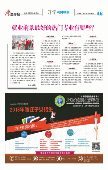 不少家长在困惑初中生想选择中职校,可是对于各类专业非常迷茫。从往届各个学校报名情况来看,电子商务、会计、学前教育、护理、烹饪、酒店、汽修等专业热度较高。 据2017年数据显示,中职毕业生主要分布在17个专业大类、138个专业,对应三大产业和22个行业大类。毕业生人数居前五位的是加工制造类、财经商贸类、交通运输类、信息技术类和医药卫生类,占毕业生总数的70.64%,就业率98.65%,比全市平均就业率高0.28个百分点。体育与健身类就业率继续排名末尾,为76.79%外,其余专业大类的就业率均在97%以上。结合网络信息,罗列了几个热门专业,供学生们参考。 记者 朱筱丽 计算机网络 计算机行业的分类很多,像平面设计、室内装修设计、网页制作、游戏编程、软件开发、电子商务等专业都是属于计算机类的。计算机,与时代气息息息相关的专业,也成为最近几年就业比较火的专业。计算机网络专业就业前景是非常可观的。 电子商务 电子商务属于工商管理类别。本专业学生毕业后可以从事企事业单位网站的网页设计、网站建设和维护或网络编辑、网站内容的维护和网络营销(含国际贸易)、企业商品和服务的营销策划等专业工作,或从事客户关系管理、电子商务项目管理、电子商务活动的策划与运作、电子商务系统开发与维护工作以及在各级学校从事电子商务教学等工作。 数控加工 数控专业,比较侧重学生的动手实践能力,比较适合男生学习,这个专业就业范围非常的广泛,涉及很多个领域:机械制造技术,信息处理、加工、传输技术,伺服驱动技术,自动控制技术,传感器技术,软件技术等。这就意味着学好数控技术以后就业的可选择性很多! 汽车维修 我国已经成为世界第一大汽车市场,相应地,汽车维修企业也将持续增加才能满足汽车的维修服务市场,消费者对维修企业的服务要求也越来越高。汽修行业的创业和择业就相对更易成功。 护理专业 在国内,护理人才是紧缺人才。各大医院频繁出现护理人员短缺现象,专业的护理人才少之又少,所以学习护理无疑是一个不错的选择。一提到护士就想到白衣天使的形象,是受人们尊崇又高尚的职业。 市场营销 在各大招聘会上,招聘市场人才的职业是最多的。因为好多企业的核心竞争力就在于市场营销人才。该专业历年平均就业率达97%左右。市场营销也是一个有挑战、有激情需要付出努力的一行。喜欢冒险、勇于挑战、肯于付出、想从事管理工作和营销工作的学生可以选择此专业。