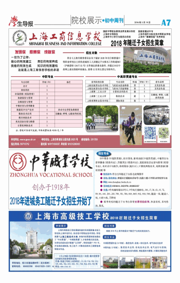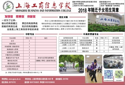 国家中等职业教育改革发展示范校 国家级重点中专 上海市文明单位 上海市现代化标志性中等职业学校 上海市中小学行为规范示范校 上海市“健康校园”优秀单位 发现你 欣赏你 成就你 一切为了让你: 信心的有效建立 责任的有效养成 技能的有效生成 知识的有效建构 这就是上海工商信息学校的承诺 招生对象 符合《上海市教育委员会关于做好2018年全日制普通中等职业学校自主招收进城务工人员随迁子女报名工作的通知》(沪教委职〔2017〕32号)文件规定的报名条件,并通过本市中招网上报名资格审核确认、获得12位考生登记号的考生。 学校网址:www.gsxx.sh.cn 学校校址:上海市青浦区公园东路2025号 邮政编码:201700招生热线:59715712 潘老师18017156937,李老师18121236905