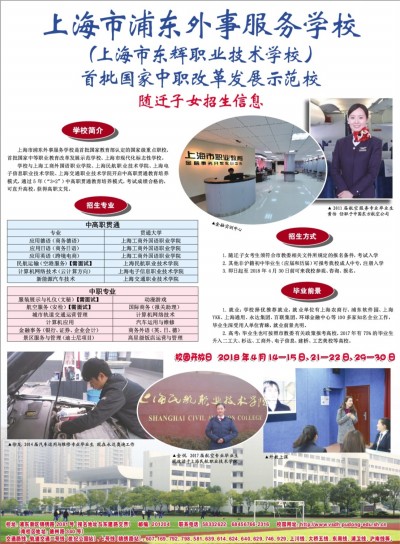 (上海市东辉职业技术学校)首批国家中职改革发展示范校 随迁子女招生信息 学校简介 上海市浦东外事服务学校是首批国家教育部认定的国家级重点职校、首批国家中等职业教育改革发展示范学校、上海市现代化标志性学校。 学校与上海工商外国语职业学院、上海民航职业技术学院、上海电子信息职业技术学院、上海交通职业技术学院开启中高职贯通教育培养模式,通过5年(“3+2”)中高职贯通教育培养模式,考试成绩合格的,可直升高校,获得高职文凭。 招生方式 1.随迁子女考生须符合市教委相关文件所规定的报名条件,考试入学2.其他非沪籍初中毕业生(应届和历届)可报考我校成人中专,注册入学3.即日起至2018年4月30日前可来我校参观、咨询、报名。 毕业前景 1.就业:学校择优推荐就业,就业单位有上海农商行、浦东软件园、上海YKK、上海通用、永达集团、百联集团、环球金融中心等100多家知名企业工作,毕业生深受用人单位青睐,就业前景光明。 2.高考:毕业生也可按照市教委有关政策报考高校。2017年有75%的毕业生升入二工大、杉达、工商外、电子信息、建桥、工艺美校等高校。 校园开放日 2018年4月14—15日、21—22日、29—30日 校址:浦东新区锦绣路2081号(报名地址与东建路交界) (南校区地址:德州路340号) 邮编:201204 联系电话:5833262268456766-2316 校园网址:http://www.vsdh.pudong-edu.sh.cn 交通路线:轨道交通二号线(世纪公园站)、七号线(锦绣路站);607、169、792、798、581、639、614、624、640、629、746、929、上川线、大桥五线、东周线、浦卫线、沪南线等。