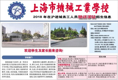 2018年在沪进城务工人员 随迁子女招生信息 学校简介 我校创建于1959年,是一所具有近60年悠久历史的综合类全日制公办中专学校。学校占地面积60亩,教学用房达三万多平方米,拥有大量现代的教学、实验、实训设施。可容纳1800多名学生住宿,均为全新装修配有空调的学生宿舍。 我校师资力量雄厚,拥有博士2名,硕士24名,具有中高级职称的教师达93%,拥有大批的上海市优秀教师、先进工作者及优秀园丁,教学经验丰富。学生毕业后可选择就业或升入高职院校继续深造,我校历年来就业率很高,还有大批同学升入高职院校。 电话:64773208(总机)*8022 64779303(招办直线) 校址:徐汇区天等路465号(咨询地点:天等路395号招办) 邮编:200237 网址:www.shmis.com.cn 交通:轨道交通一号线转50、157、720等公交车;三号线转720、957、111、156等公交车;其他公交线路131、729、804、755、松龙线、徐梅线、沧石线、鲁莘线等,另外,各郊区专线车到上海南站后,转156公交车即到本校。