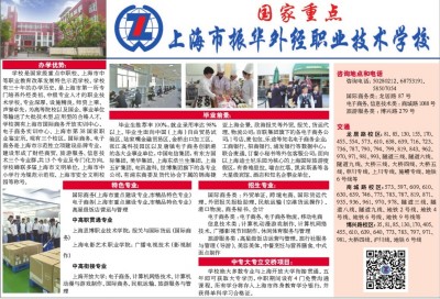 办学优势: 学校是国家级重点中职校、上海市中等职业教育改革发展特色示范学校。学校有三十年的办学历史,是上海市第一所专门培养外经类初、中级专业人才的职业技术学校。专业深厚、设施精良、师资上乘、声誉卓先,为高等院校以及国企、事业单位等输送了大批技术型、应用型的合格人才。学校拥有上海市国际商务开放实训中心、电子商务实训中心、上海市第38国家职业鉴定所。现有三个校区,国际商务、电子商务是上海市示范性立项建设品牌专业,建设形成了财经商贸、旅游服务、信息技术三个专业群,共13个专业及专门化方向。学校蝉联多届上海市文明单位、上海市中小学行为规范示范校、上海市安全文明校园等称号。 毕业前景: 毕业生推荐率100%,就业录用率达98%以上。毕业生面向中国(上海)自由贸易试验区、陆家嘴金融贸易区、金桥出口加工区、张江高科技园区以及唐镇电子商务创新港的各大企事业单位,中国电信集团,有东方国际集团、美华集团、上海东浩兰生集团、上海五矿集团、电讯盈科、世博集团旗下的各专业公司,有浦东商委及货代协会下属的锦海捷亚上海全景、欣海报关等外贸、报关、货运代理、物流公司;百联集团旗下的各电子商务公司;1号店、麦包包、乐途等知名电子商务企业;工商银行、招商银行、浦发银行等数据中心;联合麦通、订餐小秘书等外包客服公司;面向以上海迪士尼乐园为核心的上海国际旅游度假区,有香格里拉、瑞吉红塔、凯宾斯基等各大星级宾馆、酒店和知名企事业单位。 特色专业: 国际商务(上海市重点建设专业、市精品特色专业) 电子商务(上海市重点建设专业、市精品特色专业) 高星级饭店营运与管理 中高职贯通专业 上海思博职业技术学院:报关与国际货运(国际商务) 上海电影艺术职业学院:广播电视技术(影视制作) 中高衔接专业 上海开放大学:电子商务、计算机网络技术、计算机动漫与游戏制作、国际商务、民航运输、旅游服务与管理 招生专业: 国际商务类:外贸单证、跨境电商、国际货运代理、外贸报关报检助理、民航运输(空港货运操作)、港口物流、商务秘书、会计 电子商务类:电子商务、电子商务物流、移动电商 信息技术类:计算机动漫游戏制作、计算机网络技术、广播影视节目制作、休闲体育服务与管理 旅游服务类:高星级饭店运营与管理、旅行社服务与管理(导游)、美容美体、中餐烹饪与营养膳食、中式面点制作 中专大专立交桥项目: 学校绝大多数专业与上海开放大学衔接贯通。五年即可获取大专学历,中职期间设有4门免费沟通课程。所有学分将存入上海市终身教育学分银行,井获得单科学习合格证。 咨询地点和电话 咨询电话:50280212、68753191、58507054 国际商务类:龙居路87号 电子商务、信息技术类:商城路1088号 旅游服务类:博兴路279号 交通 龙居路校区:81、85、130、155、170、455、554、573、610、638、639、716、723、736、787、790、794、799、819、843、962、970、971、981、993、隧道三线、隧道六线、隧道九线、大桥三线、大桥四线、大桥五线、申川专线、上川专线、施嶗专线、地铁6号线等 商城路校区:573、597、609、610、630、639、746、775、783、787、819、871、935、936、961、970、978、隧道三线、隧道八线、隧道九线、地铁2号线、地铁4号线、地铁6号线、地铁9号线等 博兴路校区:35、81、85、 130、170、405、455、610、639、640、773、783、797、971、981、大桥四线、沪川线、地铁6号线