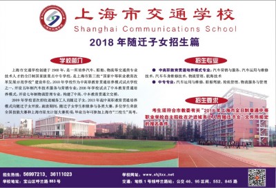 2018年随迁子女招生篇 学校简介 上海市交通学校创建于1960年,是一所培养汽车、船舶、物流等交通类专业技术人才的全日制国家级重点中专学校,是上海市第三批“国家中等职业教育改革发展示范学校”建设单位。2010年学校作为中高职教育贯通培养模式试点学校之一,开设五年制汽车技术服务与营销专业;2016年学校试点了中本教育贯通培养模式,开设七年制物流管理专业,构建了中高、中本教育贯通立交桥。 2009年学校首次招收进城务工人员随迁子女。2013年起中高职教育贯通培养模式向随迁子女开放。就读期间,随迁子女学生积极参与各类大赛,多位学生荣获全国技能大赛和上海市星光计划大赛奖项;毕业当年可参加上海市“三校生”高考。 招生专业 ● 中高职教育贯通培养模式专业:汽车营销与服务、汽车运用与维修技术、汽车车身维修技术、物流管理、航海技术 ● 中专专业:汽车运用与维修、船舶驾驶、轮机管理、物流服务与管理 招生要求 考生须符合市教委有关“2018年上海市全日制普通中等职业学校自主招收在沪进城务工人员随迁子女”文件所规定的报名条件。 招生热线:56997213、36111023 学校地址:宝山区呼兰路883号 学校网址:www.shjtxx.net 交通:地铁1号线呼兰路站;公交46、95区间、552、845路