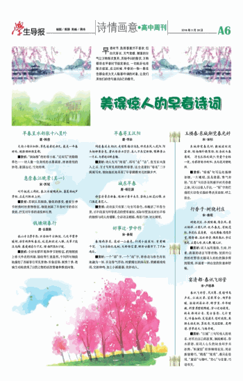 早春时节,虽然春意并不甚浓,但白天渐长,天气变暖,潮湿的空气让万物渐次复苏。历经冬日的蛰伏,万物都将在早春时节焕发新生,一切美好也将渐次绽放。在古时候,早春的一物一景往往都会成为文人骚客吟诵的对象。让我们用他们的诗句装点自己的春天。 早春呈水部张十八员外 唐·韩愈 天街小雨润如酥,草色遥看近却无。最是一年春好处,绝胜烟柳满皇都。 ■赏析:“润如酥”的初春小雨,“近却无”的隐隐草色——诗人像一位高明的水墨画家,挥洒着他的妙笔,兼摄远近,空处传神。 惠崇春江晚景(其一) 宋·苏轼 竹外桃花三两枝,春江水暖鸭先知。蒌蒿满地芦芽短,正是河豚欲上时。 ■赏析:苏轼以其细致、敏锐的感受,捕捉住季节转换时的景物特征,细致刻画了早春时节的春江景致,抒发对早春的喜悦和礼赞。 钱塘湖春行 唐·白居易 孤山寺北贾亭西,水面初平云脚低。几处早莺争暖树,谁家新燕啄春泥。乱花渐欲迷人眼,浅草才能没马蹄。最爱湖东行不足,绿杨阴里白沙堤。 ■赏析:全诗扣紧环境和季节的特征,把刚刚披上春天外衣的西湖,描绘得生意盎然。中间四句细致地描绘了西湖春行所见景物,形象活现,寓情于景,准确生动地表现了自然之物的活泼情趣和雅致闲情。 早春寄王汉阳 唐·李白 闻道春还未相识,走傍寒梅访消息。昨夜东风入武阳,陌头杨柳黄金色。碧水浩浩云茫茫,美人不来空断肠。预拂青山一片石,与君连日醉壶觞。 ■赏析:诗人先写“闻道”,再写“走”“访”,直至东风荡入之后,方才写所见到的焕然春景,这全是紧扣“春还”二字娓娓写来,细如抽丝地再现了早春姗姗来迟的脚步声。 城东早春 唐·杨巨源 诗家清景在新春,绿柳才黄半未匀。若待上林花似锦,出门俱是看花人。 ■赏析:此诗虽只有第二句实写春色,却概括了早春全景。后半段虽写仲春观花的惯常盛况,实际却更加反衬出早春的独特与诗人的慧眼。全诗语言精练,构思巧妙,对比鲜明。 好事近·梦中作 宋·秦观 春路雨添花,花动一山春色。行到小溪深处,有黄鹂千百。 飞云当面化龙蛇,夭矫转空碧。醉卧古藤阴下,了不知南北。 ■赏析:一个“添”字,一个“动”字,将春花与春色有机地融为一体。在这春气浮动、姹紫嫣红的深山里,黄鹂嬉戏喧闹,交相和鸣,加上小溪潺潺,美妙动人。 玉楼春·东城渐觉春光好 宋·宋祁 东城渐觉春光好,觳皱波纹迎客棹。绿杨烟外晓寒轻,红杏枝头春意闹。 浮生长恨欢娱少,肯爱千金轻一笑。为君持酒劝斜阳,且向花间留晚照。 ■赏析:“绿杨”句写远处杨柳如烟,一片嫩绿,虽是清晨,寒气却轻;“红杏”句以杏花的盛开衬托春意之浓。词人以拟人手法,一“闹”字将烂漫的大好春光描绘得活灵活现,呼之欲出。 行香子·树绕村庄 宋·秦观 树绕村庄,水满陂塘。倚东风、豪兴徜徉。小园几许,收尽春光。有桃花红,李花白,菜花黄。 远远围墙,隐隐茅堂。飏青旗、流水桥旁。偶然乘兴、步过东冈。正莺儿啼,燕儿舞,蝶儿忙。 ■赏析:词人运用通俗、生动、朴素、清新的语言写景状物;使质朴自然的村野春光随词人轻松的脚步得到展现,洋溢着一种由衷的快意和舒畅。 宴清都·春讯飞琼管 宋·卢祖皋 春讯飞琼管。风日薄、度墙啼鸟声乱。江城次第,笙歌翠合,绮罗香暖。溶溶涧渌冰泮。醉梦里、年华暗换。料黛眉重锁隋堤,芳心还动梁苑。新来雁阔云音,鸾分鉴影,无计重见。啼春细雨,笼愁澹月,恁时庭院。离肠未语先断。算犹有、凭高望眼。更那堪、芳草连天,飞梅弄晚。 ■赏析:“江城”三句写他人的欢乐,衬托出自己的寂寞。涧流解冻,春水溶溶,而词人心头的块垒却并未冰释;“料黛眉”形容柳绿花发,用语新丽精巧。“隋堤”“梁苑”,都只是借用。“黛眉”与柳叶、“芳心”与花蕾,巧语双关。