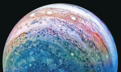 在人类拍摄的木星照片中,常常出现剧烈的风暴,令人浮想联翩。而一项新研究则揭露了这些风暴究竟有多深。 专家在分析NASA朱诺号探测器收集的数据后发现,在木星表面云层下方约3000公里处,存在“反常”重力和高速气流。木星两极各有一团直径数千公里的巨大气旋。这些气旋周围分布着多处风暴,北极有八处,南极有五处。 大量氢气和氦气如固体般在木星深处旋转,从而引发木星表面的风向变化。这部分木星大气约占木星总质量的一百分之一。而地球大气的质量仅占地球总质量的一百万分之一。这部分内层大气损失的能量推动气流向上运行,最终到达木星表面,从而创造出木星上层大气中液体般的运动现象。 在传回地球的照片中,我们常常能看到这些如油画笔触般惊人的图案。