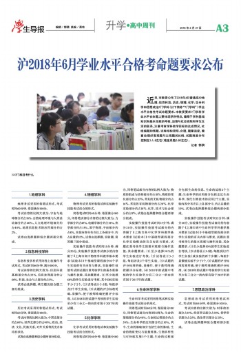 近日,市教委公布了2018年6月普通高中地理、信息科技、历史、物理、化学、生命科学和思想政治7门学科(以下简称“7门学科”)学业水平合格性考试命题要求。市教委要求7门学科学业水平在命题上要体现学科特点,着眼于学科基础知识和基本技能的考核,加强与社会实际和学生生活的联系,注重考查学科教学目标的达成情况,杜绝偏题和怪题。试卷结构简明、合理,题量适度,着重处理好客观题与主观题的比例。试题难度分布控制在1:1:8左右(难度系数0.85左右)。 记者 郭漪 >>>7门科目考什么 1.地理学科 地理考试采用闭卷笔试形式。考试时间60分钟,卷面满分100分。 考试内容的比例大致为:宇宙与地球部分约占18%,自然地理环境与人类活动部分约占40%,人文地理环境部分约占40%,地理信息技术的应用部分约占2%。 试卷由选择题和综合题两部分组成。 2.信息科技学科 信息科技学科采用闭卷上机操作考试形式。考试时间60分钟,满分100分。 考试内容的比例大致为:信息科技基础部分约占35%,信息处理部分约占60%,科技、社会与人部分约占5%。 试卷由选择题、填空题及综合题三部分组成。 3.历史学科 历史考试采用闭卷笔试形式。考试时间60分钟,卷面满分100分。 考试内容的比例大致为:中国史部分约占60%,世界史部分约占40%。政治、经济、文化、民族关系、对外关系等历史内容均有涉及。 试卷由选择题和综合题两部分组成。 4.物理学科 物理考试采用闭卷笔试和实验操作技能考试结合的形式。 闭卷笔试时间60分钟,卷面满分100分。闭卷笔试部分内容的比例大致为:力学部分约占45%,电磁学部分约占32%,热学部分约占15%,原子物理、宇宙部分约占8%。实验内容分布在以上各部分中,约占总量的15%。试卷由选择题、实验题、简答题三部分组成。 实验操作技能考试时间15分钟,满分20分。实验操作技能考试部分的内容限于《上海市高中物理学科教学基本要求(试验本)》中基础型课程部分10个学生实验的有关内容与要求。实验操作技能考试的试题注重考核学生的基本观察与操作技能,其命题要求:(1)至少选择60%的学生实验进行考核,其中DIS实验不少于2个。(2)试卷设计3-5组,每组涉及2个学生实验。(3)试题的评分标准明确,易操作,便于教师准确把握评分标准。(4)2018年的试题中考核的学生实验至少有三分之一的内容有别于2017年的试题。 5.化学学科 化学考试采用闭卷笔试和实验操作技能考试结合的形式。 闭卷笔试时间60分钟,卷面满分100分。闭卷笔试部分内容的比例大致为:物质的组成与结构部分约占18%,物质的变化部分约占20%,常见的无机物部分约占16%,常见的有机物部分约占20%,化学实验部分约占18%,化学、技术与社会部分约占8%。试卷由选择题和综合题两部分组成。 实验操作技能考试时间15分钟,满分20分。实验操作技能考试部分的内容限于《上海市高中化学学科教学基本要求(试验本)》中基础型课程部分化学实验模块的有关内容与要求。试题注重考核学生的基本观察与操作技能,其命题要求:(1)至少选择50%的学生实验进行考核。(2)试卷设计3-5组,每组涉及2个学生实验。(3)试题的评分标准明确,易操作,便于教师准确把握评分标准。(4)2018年的试题中考核的学生实验至少有三分之一的内容有别于2017年的试题。 6.生命科学学科 生命科学考试采用闭卷笔试和实验操作技能考试结合的形式。 闭卷笔试时间60分钟,卷面满分100分。闭卷笔试部分内容的比例为:生命的基础部分约占40%,生命的过程部分约占50%,生命科学的应用部分约占10%。其中,生命的基础部分包括生命的基础、生命的物质变化与能量转换、生物多样性与可持续发展3个主题;生命的过程部分包括生命的信息、生命的延续2个主题;生命科学的应用部分包括走近生命科学、现代生物技术的应用2个主题。实验内容分布在以上各部分中,约占总量的10%。试卷由选择题和综合题两部分组成。 实验操作技能考试时间15分钟,满分20分。实验操作技能考试部分的内容限于《上海市高中生命科学学科教学基本要求(试验本)》中基础型课程部分的学生实验的有关内容与要求。试题注重考核学生的基本观察与操作技能,其命题要求:(1)至少选择50%的学生实验进行考核。(2)试卷设计3-5组,每组涉及2个学生实验(或实验的两个步骤),每组中显微镜实验不少于1个。(3)试题的评分标准客观明确,便于教师准确把握评分标准。(4)2018年的试题中考核的学生实验至少有三分之一的内容有别于2017年的试题。 7.思想政治学科 思想政治考试采用闭卷笔试形式。考试时间60分钟,卷面满分100分。 考试内容的比例大致为:时事政治部分占15%,经济常识部分占35%,哲学常识部分占25%,政治常识部分占25%。 试卷由选择题和综合题两部分组成。