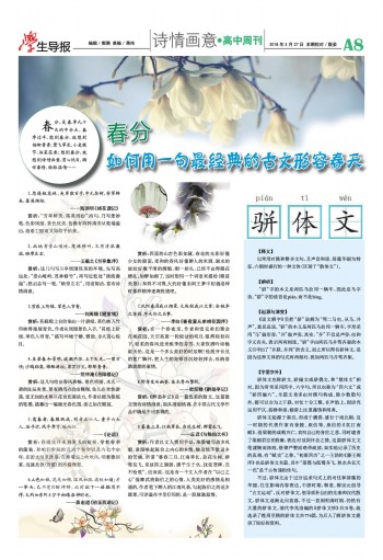 春分,是春季九十天的中分点。春季过半,想到春分,就想到杨柳青青、莺飞草长、小麦拔节、油菜花香;想到春分,就想到诗情画意、赏心悦目、胸怀豪情、脉脉温情…… 1.忽逢桃花林,夹岸数百步,中无杂树,芳草鲜美,落英缤纷。 ——陶渊明《桃花源记》 赏析:“芳草鲜美,落英缤纷”两句,乃写景妙笔,色彩绚丽,景色优美,仿佛有阵阵清香从笔端溢出,造语工丽而又如信手拈来。 2.此地有崇山峻岭,茂林修竹,又有清流激湍,映带左右。 ——王羲之《兰亭集序》 赏析:这几句写兰亭周围优美的环境。先写高远处:“崇山峻岭,茂林修竹”;再写近低处“清流激湍”;然后总写一笔:“映带左右”。用语简洁,富有诗情画意。 3.苔痕上阶绿,草色入帘青。 ——刘禹锡《陋室铭》 赏析:苔藓爬上台阶染出一片碧绿,草色映入竹帘映得漫屋青色。作者从周围景色入手,“苔痕上阶绿,草色入帘青。”描写环境宁静、雅致,令人赏心悦目。 4.至若春和景明,波澜不惊,上下天光,一碧万顷;沙鸥翔集,锦鳞游泳;岸芷汀兰,郁郁青青。 ——范仲淹《岳阳楼记》 赏析:这几句绘出春风和畅、景色明丽、水天一碧的良辰美景。更有鸥鸟在自由翱翔,鱼儿在欢快游荡,连无知的水草兰花也充满活力。作者以极为简练的笔墨,描摹出一幅湖光春色图,读之如在眼前。 5.莫春者,春服既成,冠者五六人,童子六七人,浴乎沂,风乎舞雩,咏而归。 ——《论语》 赏析:春暖花开未到夏天的时候,穿着春季的服装,和咱们学院的五六个青年以及六七个少年,在沂水河里洗澡,在舞雩坛上吹吹风,唱着歌回家,这就是我(曾皙)的终极理想。 6.山色如娥,花光如颊,温风如酒,波纹如绫;才一举头,已不觉目酣神醉,此时欲下一语描写不得,大约如东阿王梦中初遇洛神时也。 ——袁宏道《初至西湖记》 赏析:四面的山峦色彩如黛,春花的光彩好像少女的颜面,柔和的春风好像醉人的米酒,湖水的波纹好像平滑的绸缎,刚一抬头,已经不由得眼花缭乱,如醉如痴了。这时想用一个词语来描绘(眼前美景),却终不可得,大约好像东阿王梦中初遇洛神时那样精神迷离恍惚吧。 7.况阳春召我以烟景,大块假我以文章;会桃李之芳园,序天伦之乐事。 ——李白《春夜宴从弟桃花园序》 赏析:在一个春夜里,作者和堂兄弟们聚会在桃花园。天空高悬一轮皎洁的明月,银辉轻轻泻下。轻柔的春风送来桃李的芬芳,大家饮酒吟诗畅叙天伦,这是一个多么美好的时辰啊!他展开长兄的宽广胸怀,把人生的宠辱浮沉轻轻挥去,吐纳借酒放歌的豪情。 8.野芳发而幽香,佳木秀而繁阴。 ——欧阳修《醉翁亭记》 赏析:《醉翁亭记》是一篇优美的散文。这篇散文饶有诗情画意,别具清丽格调,在中国古代文学作品中确是不可多得的。 9.暮春三月,江南草长,杂花生树,群莺乱飞。 ——丘迟《与陈伯之书》 赏析:作者以文人惯用手法,浓墨铺写故乡风貌,意图唤起陈伯之内心的乡情,触及他不能返乡的苦痛,所谓“暮春三月,江南草长,杂花生树,群莺乱飞。见故国之旗鼓,感平生于仇,抚弦登陴,岂不怆恨”。应该说,这是有一个文人作者在“以己之心”揣摩武将陈伯之的心情,人类美好的感情是相通的,作者笔下醉人的江南风景,勾起陈伯之的返乡愿景,可洋溢在字里行间的,是一股脉脉温情。