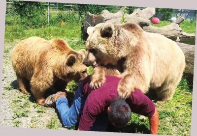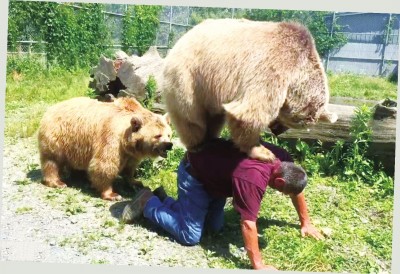 美国饲养员背起360斤顽皮熊 大玩平衡游戏