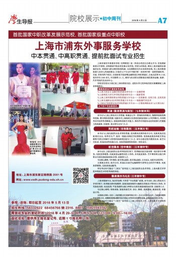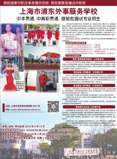 首批国家中职改革发展示范校、首批国家级重点中职校 中本贯通、中高职贯通、提前批面试专业招生 上海市浦东外事服务学校(东辉职校)是一所综合性的公办职业中专,首批国家级重点中职校,首批国家中职改革发展示范学校。学校与时俱进,顺应上海卓越的全球城市定位,积极参与职业教育体系构建,主动调整优化专业布局和结构,经上海市教委批准与本市七所高校联合,分别在九个专业中开展中职-本科和中职-高职贯通培养。目前,学校有两个校区,分别坐落于陆家嘴金融贸易区和世博园区,占地总面积91.5亩,现有学生2400多人,专任教师211人。拥有与社会职业资格鉴定相匹配的金融、旅游、汽车等现代化实训中心。 学校首任校长万善正是上海市教育功臣,老校长李文亮和现任校长陈耀都是上海市特级校长。 提前批招生不面试的专业有: 与上海立信会计金融学院贯通本科专业——金融营销 与上海师范大学天华学院贯通本科专业——旅游管理 与上海工商外国语职业学院贯通大专专业——应用德语、应用日语、应用英语 与上海交通职业技术学院贯通大专专业——新能源汽车技术 与上海电子信息职业技术学院贯通大专专业——计算机网络技术(云计算方向) 以下四个专业需面试: 表演(服装表演与策划)(七年制本科) 本专业与上海工程技术大学贯通,将通过七年一贯制的培养模式,集聚两院校优势和经验,整合两院校资源,创新具有上海海派文化特征的服装表演人才培养模式,共同培养具有创作性思维能力、服装服饰表演艺术能力、国内外时尚前沿动态的观察与把握能力的高素质、技能型、复合型专业专门人才。 民航运输(空港服务)(五年制大专) 本专业与上海民航职业技术学院贯通,面向国内及国外航空公司、民航机场及民航相关企业,培养在生产、服务一线能从事航空客票销售、旅客地面服务和航空货运销售代理业务操作与管理的高素质技能专门人才。本专业通过校内模拟实训、航空公司实训、机场实训等实践方式,实现贯通课程体系的一体化设计。 航空服务(空中乘务)(三年制中专) 本专业在上海民航职业技术学院的引领下,培养能在航空服务第一线从事空中乘务、民航客票销售、民航旅客运输等岗位工作的,具有地面服务、空中乘务职业能力和职业生涯发展基础的知识型、技能型人才。 专业核心课程:空中乘务、航空货运服务、航空客运服务、公关礼仪、民航专业英语等。 主要就业岗位:航空公司、机场以及航空运输销售代理等企业的空中乘务、民航客票销售、民航旅客运输等。 学生毕业时可通过“三校生”高考进入上海民航职业技术学院、上海电影艺术学院和视觉艺术学院等高校深造。 服装展示与礼仪(三年制中专) 上海市紧缺专业,免交学杂费,可享受“专业奖励”政策。本专业在上海工程技术大学的引领下,培养能从事时装模特、服装表演的组织与编排及形象设计等岗位工作的,具有服装表演、动态造型、平面表演职业能力和职业生涯发展基础的知识型、技能型人才。 专业核心课程:形体训练、服装表演艺术、音乐、舞蹈、表演基础、镜前造型、形象设计等。 主要就业岗位:ESEE(上海英模文化发展有限公司)、火石文化经纪公司、上海霖杰模特经纪有限公司、龙腾精英国际模特经纪有限公司等单位的模特表演、品牌服装经营人员等。 学生毕业时可通过“三校生”高考进入上海工程技术大学、上海电影艺术学院和视觉艺术学院等高校深造。 参观、咨询:即日起至2018年5月13日 招生热线:58332622 68456766转2316、880715921593742 需面试专业的面试时间:2018年4月29-30日、5月5-6日、12-13日 9:00—16:00 面试须知:提供考生报名登记号、近期1寸报名照2张。 地址:上海市浦东新区锦绣路2081号 网址:www.vsdh.pudong-edu.sh.cn