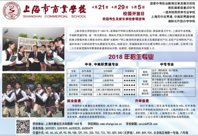 国家中等职业教育改革发展示范校 首批国家级重点中专 一流财经商贸类专业学校 上海市中本贯通、中高职贯通学校 国际化开放办学学校 4月21日 4月29日 5月5日 校园开放日欢迎考生及家长来校参观咨询 上海市商业学校创办于1960年,是国家中等职业教育改革发展示范校、国家级重点中专、上海市中本贯通、中高职贯通学校,是一所全国知名、国际化开放办学的财经商贸类学校。近年来,商校以上海区域经济社会发展的重点领域和重大需求为导向,围绕“互联网+”和上海市经济建设及重点发展的新兴产业、支柱产业和特色产业,逐步形成了以财经商贸专业群建设为龙头,创意设计、休闲服务新兴专业群为增长点的三大专业群,已培养了近二十万名深受国内外赞誉的高素质的知识型、技能型、创新型的技术技能人才。 就业前景 学校毕业生质量社会美誉度好,高考升学、就业创业、出国留学渠道通畅。2017年毕业生就业率达99%,就职去向主要集中在金融服务系统类、外贸货运系统类、商业服务系统类、旅游服务系统类等岗位。 升学前景 2017年我校三校生高考录取率为98%,历年来我校学生升学院校包括同济大学、上海外国语大学、上海音乐学院、上海大学、上海师范大学、上海理工大学、上海第二工业大学和上海商学院等知名高等院校。 学校地址:上海市静安区共和新路1458号 学校网站:www.shangxiao.cn 学校邮箱:scszsb@126.com 咨询热线:26101021、26101019、66305225、66305479 交通方式:40、46、65、69、95、98、108、129、210、253、702、722、743、829、840(北罗线)、849、869、924、北安线及地铁一号线、八号线