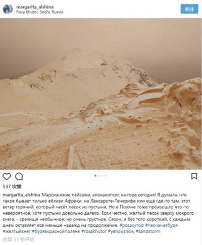 据外媒报道,俄罗斯、保加利亚、乌克兰、罗马尼亚,以及东欧内陆国家摩尔多瓦共和国,近日都出现了罕见的“橘雪”。 有民众在社交网络发布他们见到山脉被“橘雪”覆盖的照片,这些照片令东欧民众十分困惑,为何会下起“橘雪”? 气象专家指出,“橘雪”是因撒哈拉沙漠沙尘暴的沙子与白雪、雨水混合导致。这种现象约每五年就会发生一次,只是这次沙子的密度高些,因此形成“橘雪”。他们预期,雪地在数日内会恢复正常。 在俄罗斯索契市附近滑雪的游客纷纷将他们见到的异象照片张贴上网,原本白雪皑皑的山坡变得如同新月形沙丘,还有人形容如临火星和世界末日。许多人抱怨沙子会跑进他们口中。 据悉,西伯利亚2007年曾出现过“橘雪”的现象,当时科学家归咎于附近发生的一场沙尘暴。