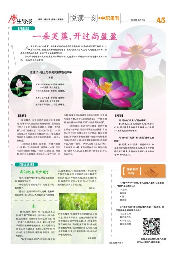 我们把春天吵醒了 春天,驾着呼啸的春风,拿起招展的春幡,高高地飞起了。 哗啦啦的春幡吹卷声中,大地上一切都惊醒了。 昆仑山,连绵不断的万丈高峰,载着峨峨的冰雪,插入青天。热海般的春气围绕着它,温暖着它,它微笑地欠伸了,身上的雪衣抖开了,融化了;亿万粒的冰珠松解成万丈的洪流,大声地欢笑着,跳下高耸的危崖,奔涌而下。它流入黄河,流入长江,流入银网般的大大小小的江河。 (冰心) 春 桃树、杏树、梨树,你不让我,我不让你,都开满了花赶趟儿。红的像火,粉的像霞,白的像雪。花里带着甜味儿;闭了眼,树上仿佛已经满是桃儿、杏儿、梨儿。花下成千成百的蜜蜂嗡嗡地闹着,大小的蝴蝶飞来飞去。野花遍地是:杂样儿,有名字的,没名字的,散在草丛里,像眼睛,像星星,还眨呀眨的。 “吹面不寒杨柳风”,不错的,像母亲的手抚摸着你。风里带来些新翻的泥土的气息,混着青草味儿,还有各种花的香,都在微微润湿的空气里酝酿。鸟儿将巢安在繁花嫩叶当中,高兴起来了,呼朋引伴地卖弄清脆的喉咙,唱出宛转的曲子,与轻风流水应和着。牛背上牧童的短笛,这时候也成天嘹亮地响着。 (朱自清)