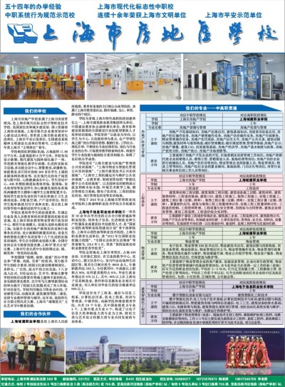 五十四年的办学经验 上海市现代化标志性中职校中职系统行为规范示范校 连续十余年荣获上海市文明单位 上海市平安示范单位 我们的学校 上海市房地产学校隶属于上海市房屋管理局,是上海市现代化标志性中等职业技术学校,是国家住房和城乡建设部、国土资源部上海培训基地、上海市现代企业教育培训中心建设试点单位。曾荣获上海市职业教育先进单位、上海市平安示范单位、全国建设系统精神文明建设先进单位等称号,已连续十六年获上海市“文明单位”称号。 学校毗邻虹桥国际机场,占地面积11.88万平方米,总建筑面积8万平方米。学校布局设计新颖,现代建筑与园林绿化融于一体。学校拥有智能化教学行政楼、先进的实验实习设施、多功能会议中心、智慧教室、录播教室、体能教室及可同时容纳200多名学生上课的多媒体网络教室等,还有现代化的电子阅览室与图书馆、心理健康成长中心、学生活动中心、400米塑胶跑道标准体育场、篮球场、室内体育馆等促进学生身心健康发展的各类场所。两幢教学大楼和六幢学生公寓都配置齐全,每间学生宿舍均设有四个床位和独立卫生及淋浴设备,并配备空调,户户设有阳台,每位学生配单独使用写字桌和衣柜,是目前上海同等学校中最舒适的学生公寓之一。 学校注重培养学生的技能素养,有满足行业各类人员教育和培训所需要的实验实训设施,是上海市职业教育物业管理开放实训中心,拥有行业规模大、设施先进的电梯实训工场;功能齐全的房地产销售实训室和行政事务实训室;设计新颖的测量实训室;设备完善的智能化楼宇实训室等十几个先进的实验实训场所。学生在全国职业技能大赛、全国行业协会及专指委技能竞赛、上海市“星光计划”比赛、上海市行业比武中分别获得过金、银、铜奖和一等奖的好成绩。 学校围绕“做精、做特、做强”的办学理念和“厚德、尚能、至善”的校训,努力提升学生的综合素质,校园文化建设朝着制度化、多样化、广泛性、高水平的方向发展。十八岁成人仪式、田径运动会、艺术节、歌咏比赛等学校传统活动都要有明确主题和丰富的形式。音乐剧的普及教育、汉字听写大赛等新型活动的举办提升了校园文化氛围,优化了育人环境。针对住宿生,学校利用晚自习等业余时间,开设硬笔书法、动漫欣赏、建筑模型等第二课堂,安排专业教师管理与辅导。近年来,我校师生在全国文明风采大赛、上海市“璀璨星光”文化艺术节中屡获佳绩。 我们的合作伙伴 上海城建职业学院是经上海市人民政府批准、教育部备案的全日制公办高等院校,隶属于上海市教育委员会。拥有杨浦、宝山、奉贤、静安四个校区。 学院为首批上海市特色高职院校创建单位之一、上海市建筑职业教育集团牵头单位、中国建设教育协会副理事长单位、教育部和建设部批准的全国建设行业技能型紧缺人才培养培训基地。学院坚持“以就业为导向、以学生为中心、以技能培养为重点、走产学研发展之路”的办学指导思想,根植行业、工学结合、理实并举,不断优化专业结构布局,深化与行业企业的合作,开展教育教学探索和改革,将提升学生专业技能与提高综合素质相融合,取得了良好的办学成效。 学院设有“上海市建设与房地产管理类公共实训基地”、“上海市物业与智能化管理公共实训基地”、“上海市建筑技术公共实训基地”、“上海市工程机械运用与维护公共实训基地”、由教育部、财政部资助的“智能化楼宇公共实训基地”,以及园林实训植物展示温室和树木标本园、环境艺术教学工场、酒店管理实习基地、微电子实训室、工程招投标实训室、项目管理实训室等实训场地。 学院于2016年由上海城市管理职业技术学院和上海建峰职业技术学院合并组建而成。 上海电子信息职业技术学院是一所具有50余年办学历史的公办全日制普通高等职业院校,培养电子信息、先进制造业和生产性服务业高素质技术技能型人才,是“国家示范性高等职业院校建设计划”骨干高职院校、上海市示范性高等职业技术院校、上海市职业教育先进单位,获“2012年全国职业院校魅力校园”、“全国社会扶贫先进集体”等荣誉称号,2014年5月,荣获“第四届黄炎培职业教育优秀学校奖”。 学院总部地处上海市奉贤区,占地400余亩,另有徐汇校区,有完备的教学中心、实训中心、图文信息中心、室内外运动场和生活园区等。现有全日制在校生8600余人,专兼职教师近500人。专任教师中,中高级以上职称占90%,双师素质教师占91%。毕业生就业率稳定在97%以上,其中,90%以上在上海电子信息制造业、软件和信息服务业及相关行业就业,用人单位对毕业生的综合满意率达90%以上。 学院设有电子工程系、通信与信息工程系、计算机应用系、机电工程系、经济与管理系、中德学院、动画学院和继续教育学院,共有29个专业,其中国家级重点专业4个, 上海市重点专业6个, 构成了以电子信息大类和制造大类专业为主体,财经大类与艺术设计传媒大类专业共同发展的专业体系。 学校地址:上海市青浦区高泾路588号 邮政编码:201702 联系方式:学校南楼 B410 招生就业办 招生咨询:59889077 18721878673 韩老师 18817246709 李老师 交通方式:地铁2号线徐泾东站8号出口换乘徐泾5路(高泾路方向)或706路,至高泾路河泾港路(房地产学校)站/地铁9号线九