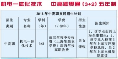 ★ 专业名称:机电一体化技术 ★ 教育类型:中高职教育贯通培养 ★ 学历层次:高职高专 ★ 招生对象:应届初中毕业生 ★ 学制:五年 学校概况 上海电机学院是一所以工学为主,相关门类或领域多学科相互渗透、协调发展的全日制普通高等院校。高职学院是上海电机学院下属的一个二级教学单位,现有在校学生2739人,重点开设以机电为主,文、管、信息为辅的10余个专业或方向。上海电机学院长期以培养高质量的技术技能人才见长,在上海乃至全国享有盛誉。2014年该校的“校企全程联合培养高技能人才的探索与实践”曾获得国家教学成果一等奖。 上海市环境学校创建于1974年,是教育部批准的国家级重点中专,是上海市教委认定的上海市中等职业教育改革发展特色示范学校,已连续二十年荣获上海市文明单位称号,是上海市职业教育开放实训中心、上海市科技教育特色学校和上海市绿色学校。学校坐落于陆家嘴金融贸易区内,环境优美、交通便捷。 专业介绍 2017年经上海市教委批准上海电机学院与上海市环境学校合作培养机电一体化专业中高职贯通班,主要面向汽车制造、电子信息产品制造、成套设备制造和环卫装备等先进制造业和现代服务业,培养从事机电设备的安装调试、检测维修、运行管理、售后服务及营销等工作的知识型、发展型、应用型技术技能人才。 就业前景 电机学院高职学院机电一体化技术专业依托行业,充分发挥行业(企业)优势,拥有20余个校外实习基地,同上海电气(集团)有限公司、宝钢股份有限公司、上海烟草(集团)公司、上海申通集团有限公司、上海国际港务(集团)股份有限公司、上海汽车工业(集团)总公司、上海机场集团有限公司等30余家行业内外企业建立长期合作伙伴关系。 学校地址:浦东新区商城路1980号 咨询热线:58604075 联系人:朱老师13023262701 王老师13331976691 网址:http://www.encollege.cn