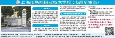 一、学校概况 上海市新陆职业技术学校是隶属于浦东新区教育局的一所公办中等职业学校,毗邻陆家嘴金融贸易区与上海外高桥保税区。交通便捷,具有得天独厚的学习、实习、就业的条件和环境。拥有包括办公楼、教学大楼、艺教中心、实训中心、信息中心、图书馆在内的功能齐全、设备先进的教育教学设施。 二、办学目标 学校将“以人为本,德技双修”作为育人理念,不断深化教育教学改革,把“人人成才,服务社会”作为各项教育教学工作的目标,不断提升与学生未来职业发展所需要的职业素养和专业技能,关注学生全面的可持续发展。 三、学前教育专业贯通高校培养人才 2015年起与上海师范大学天华学院进行学前教育专业中本贯通人才培养,2016年起与上海行健职业学院进行学前教育专业的中高职贯通人才培养,在同一母体学校内同一专业同时实施“中本”、“中高职”人才培养通道,打通人才成长立交桥,真正实现了“1+1”学段大于2的培养目标。学校在同一专业与两所高校进行不同梯度的人才培养,使得人才培养的规格不断提升,学前教育品牌专业的示范性作用不断增强。 录取办法:按市教委、市教育考试院有关文件规定录取。 贯通本科院校:上海师范大学天华学院 贯通高职院校:上海行健职业学院 四、提前批(中本贯通、中高职贯通、自荐生)招生需要面试。 面试时间:4月21日(周六)、4月 22日(周日)、5月5日(周六)、5月6日(周日)、5月12日(周六)、5月13日(周日) 咨询电话:50695730(传真),50694952,33823141,50694950 学校地址:上海市浦东北路1010号(610终点站旁) 邮编:201208 学校网址:http://www.xlzx.pudong-edu.sh.cn 交通路线:81、640、971、610、405、浦东15路、浦东35路等浦东大道沿线车辆均到东葛路东靖路车站下。