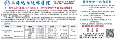 《三校生高复(本科、专科)班》、《三校生学业水平等级考试辅导班》 三校生高复是我校的传统优势项目,是上海最早创办三校生高复机构之一。十多年来,以严管理、强师资、高质量得到了广大学生和家长的肯定。近年来,平均高考录取率均在90%以上。2017年我校共有279位同学分别参加了3月、5月的高考,共有266位同学被上海市全日制大学录取(其中159位同学于3月自主招生考试中被提前录取,107位同学于5月三校生高考中录取),高考总录取率为95.3%。全市领先! 上海市教委对于三校生高考作了重大改革,三校生学业水平考试的成绩将直接与升大学挂钩。为适应三校高考新政策,满足三校生们各种层次、各种目标的愿望,我院继续开设《三校生高复(本科、专科)班》、《三校生学业水平等级考试辅导班》,精心、用心地为同学们进行全方位辅导,帮助各位同学取得好成绩!具体招生事宜告示如下: 圆大学梦—达尔高复 二、辅导课程:高复班:语文、数学、英语为主+素质技能;学业水平等级考试辅导班:语文、数学、英语。 三、任课教师:以川沙中学老师领衔,具有丰富的三校生高复教学经验的资深教师。 四、上课地点:上海达尔进修学院(川沙镇新川路317弄3号,川沙中学对面) 五、报名地址:达尔报名大厅(川沙镇新川路315号,川沙中学对面) 六、联系电话:58904494、58984970或68392303*801 【高复班三阶段同时报名有优惠】 附:我校的成人高复班已开学(可插班),考前冲刺班于7月29日开学,均参加2018年10月全国成人高考。