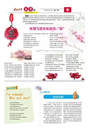 编者按:飞花令,原本是古人行酒令时的一个文字游戏,源自古人的诗词之趣,得名于唐代诗人韩翃《寒食》中的名句“春城无处不飞花”。行飞花令时可选用诗词曲中的句子,但选择的句子一般不超过七个字。《中国诗词大会》等诗词综艺栏目也引进并改良了“飞花令”,选手在规定时间内说出含有规定关键字的诗句即可。 本栏目每周会推出飞花令,帮助同学们积累古诗词佳句。 1.五花马,千金裘,呼儿将出换美酒,与尔同销万古愁 《将进酒·君不见》 唐·李白 2.牧童遥指杏花村 《清明》 唐·杜牧 3.当窗理云鬓,对镜贴花黄 《木兰诗 / 木兰辞》 南北朝·佚名 4.感时花溅泪,恨别鸟惊心 《春望》 唐·杜甫 5.稻花香里说丰年,听取蛙声一片 《西江月·夜行黄沙道中》 宋·辛弃疾 6.已是悬崖百丈冰,犹有花枝俏 《卜算子·咏梅》 近代·毛泽东 7.待到山花烂漫时,她在丛中笑 《卜算子·咏梅》 近代·毛泽东 8.东风夜放花千树 《青玉案·元夕》 宋·辛弃疾 9.春花秋月何时了 《虞美人·春花秋月何时了》 五代·李煜 10.忽如一夜春风来,千树万树梨花开 《白雪歌送武判官归京》 唐·岑参 11.云鬓花颜金步摇,芙蓉帐暖度春宵 《长恨歌》 唐·白居易 12.中有一人字太真,雪肤花貌参差是 《长恨歌》 唐·白居易 13.云鬓半偏新睡觉,花冠不整下堂来 《长恨歌》 唐·白居易 14.春风桃李花开日,秋雨梧桐叶落时 《长恨歌》 唐·白居易 15.花钿委地无人收,翠翘金雀玉搔头 《长恨歌》 唐·白居易 16.玉容寂寞泪阑干,梨花一枝春带雨 《长恨歌》 唐·白居易 17.江流宛转绕芳甸,月照花林皆似霰 《春江花月夜》 唐·张若虚 18.昨夜闲潭梦落花,可怜春半不还家 《春江花月夜》 唐·张若虚 19.晓看红湿处,花重锦官城 《春夜喜雨》 唐·杜甫 20.乱花渐欲迷人眼,浅草才能没马蹄 《钱塘湖春行》 唐·白居易 21.花自飘零水自流 《一剪梅·红藕香残玉簟秋》 宋·李清照 22.满地黄花堆积,憔悴损,如今有谁堪摘 《声声慢·寻寻觅觅》 宋·李清照 23.风住尘香花已尽,日晚倦梳头 《武陵春·春晚》 宋·李清照 24.故人西辞黄鹤楼,烟花三月下扬州 《黄鹤楼送孟浩然之广陵》 唐·李白 25.山重水复疑无路,柳暗花明又一村 《游山西村》 宋·陆游