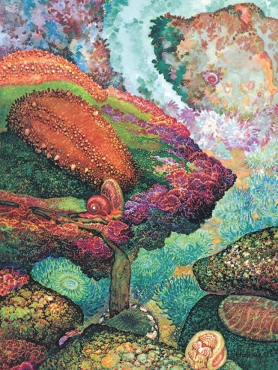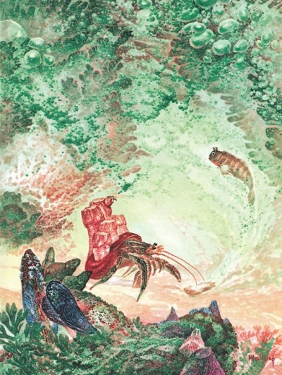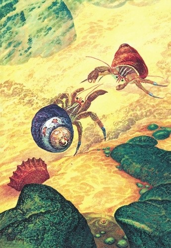 作者:【美】霍林·克兰克·霍林 周莉 译 人民文学出版社 天天出版社 (一) 大雨冲刷着岩石,白沫翻涌过潮池,使得一层淡水凌驾于潮池小镇的咸水上方。派格的壳屋被雨水瀑布从岩架上抛甩下来,在咝咝作响的淡水层上蹦跳了片刻。淡水和咸水混合后,派格失去速度,沉入了池底。 起初浑浊的水中一片模糊,随后噩梦般的场景出现在派格眼前——惊恐的生物们成群地向海的方向涌去,虾、蟹、鱼、虫,游泳的、爬行的,成千上万条模糊的影子在往深处转移。它们早就通过本能知悉,淡水会要了它们的命,而现在这种有害的淡水正在倾盆而下!连派格也得加快速度了。 疲惫的派格将壳屋拖至潮池小镇底部的一道峡谷中。越往峡谷的深处走,淡水便越稀薄。除了被四面八方的生物推来搡去这一点,派格在这里感觉安全了一些。不过,不堪拥挤的生物们的救星就快来了。每十二个小时,无论晴雨,潮水都会翻涌进来——现在,它来了,鲜浓的海水向岸上爬来,为深处增添了深度,扩大了面积,并及时将雨水变咸,救下了那些濒死的生物。 夜晚降临了,狂暴的雨势已经减弱,持续不断的海风却刮得更加猛烈。巨浪汹涌地越过峡谷时,派格和邻居们感到整个世界都在颤抖。从北方海岸漂来的浮木和古旧沉船的木料如同攻城槌一样被掷向海岸,海带在回头浪里飞荡。 (二) 巨浪撞击悬崖时,奔涌回大海的回头浪会更加汹涌。每一波被拍扁的海浪都跌落到下一波大浪之下,成吨汹涌奔流的海水撕开了海底。这种汹涌的回头浪会撕扯下一切。它搅起沙子和卵石,用比棒球还要大的石块玩杂耍,还将保龄球大小的石头吊起来,让新一波的海浪任意击打。连车轮大小、生满藤壶的大石也被它托举起来,向悬崖扔去。高耸的岩石下的碎石都被回头浪吸了出来,海浪随即将岩石一块块地推倒。多年不变的潮池的样子被改动得面目全非。 这一晚,派格数次险些丧命。由于老朋友本能先前高喊“坐稳”,派格一直坐着未动。一根浮木猛撞在峡谷壁上,造成岩石崩塌,上百万个生物被埋。派格刚爬出乱石堆,却又被蛇行而过的海带缠住,滚翻在地。大量碎石如同大型铅弹一样飞过。不过,派格全躲了过去。派格的壳屋被埋入泥中,被冲刷出来后又被埋在沙内,继而再被拖拽出来,滑落至一块大石下。 (三) 一个大浪拍歪了大石,派格侧身往石下的更深处挤去。可是,大石摇晃着压了回来。咔嚓!壳屋像坚果一样裂了缝,不过还没有散开。派格没有受伤,但这块摇摇晃晃的巨石是再也不能相信了,派格拖着壳层扭动出去,在一只螃蟹和一只龙虾之间找了一处避难所,蜷缩着等待这个狂野的夜晚过去。 与所有的夜晚一样,这个夜晚也来到了尽头,雨停了。日出时,狂风已经将力气耗尽了,但海浪依然汹涌,石块还在回头浪中翻滚。食物的味道飘散在四处。派格告别螃蟹和龙虾,挤出峡谷,跋涉回潮池小镇。与它同行的是无数回家的难民,它们以迅速的冲刺和侧步的滑行躲避滚动的石块。遵循海洋古老的传统,那些没有丧命的生物开始享用死去的生物。派格刚吃完一盘蛤肉,一个回头浪就将它卷起,裹在浪中,冲上了海岸。 (四) 大浪将它在海滩上冲出去很远,沉重地摔落在岩石上。吵闹的鸥群正拍打着翅膀,在周围享用盛宴。所以,这里不是派格该待的地方。再说了,着陆的那一下震碎了它已经裂缝的壳屋,掩体的螺壳此刻像急着去游泳的孩子脱下的衣服一样,一片片地从派格身上掉落下来,只有一块杯子状的小壳还附在尾部。可在它高抬腿,踏上一个退回潮池小镇的海浪时,连那一小块壳也脱落了。 赤身裸体的派格急需住房。风暴后是寻找螺壳的最佳时间。这时,一只波顶蝾螺壳勾住了它的目光,螺壳是橙褐色的,有纹路的表面有一个个珍珠般的凸起。派格太喜欢这只螺壳了,于是它草草地捅了捅螺壳就倒退着钻了进去,绕着壳内的管柱将尾部卷了起来。一切似乎都完美极了。 派格本应该更明智地进行更长时间的检查,但它急着要走,这间光灿灿的豪宅使它觉得自己成了最重要的人物。它长大了,寄居蟹的少年时期已经离它远去。现在,它魁梧强壮,自然想庆祝一下这个好日子。整整一天,派格趾高气扬地在潮池小镇中横行,不是硬挤进这处野餐会,就是在那处筵席上品尝美食。