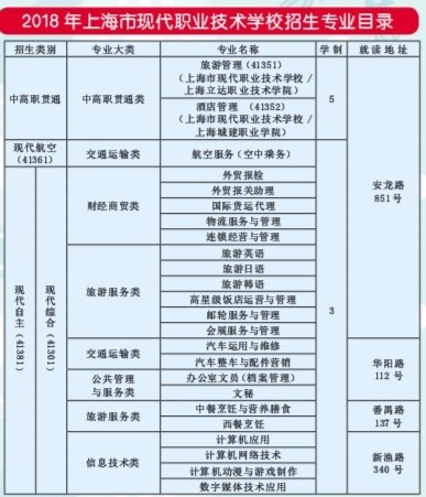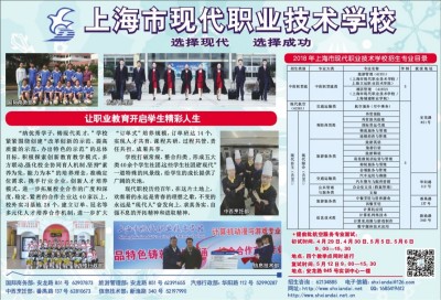 让职业教育开启学生精彩人生 “纳优秀学子,铸现代英才。”学校紧紧围绕创建“改革创新的示范、提高质量的示范、办出特色的示范”的总体目标,积极探索创新教育教学模式,多方联动,强化校企协同育人机制。坚持“素养为先,能力为本”的培养理念,准确定位需求,携手行业企业,创新人才培养模式。进一步拓展校企合作的广度和深度,稳定、紧密的合作企业达40家以上,校外实习基地28个。建立订单、冠名等多元化人才培养合作机制,进一步扩大“订单式”培养规模,订单班达14个,实现人才共育、课程共研、过程共管、责任共担、成果共享。 学校打破常规、整合归类,形成五大类40余个学生社团。这些学生社团是“现代”一道特殊的风景线,给学生的成长提供了广阔的天地。 现代职校历经百年,在这片土地上,欢奏着的永远是青春的理想之歌,不变的永远是“现代人”奋发向上、求真务实、自强不息的开拓精神和进取精神。 提前批航空服务专业面试: 初试时间:4月29日、4月30日、5月5日、5月6日 9:00—15:30 地点:四个教学点同时进行 复试时间:5月12日9:00—15:30 地点:安龙路845号实训中心一楼 国际商务部:安龙路851号 62907873 旅游管理部:安龙路851号62391655 汽修行政部:华阳路112号 52990287 中西烹饪部:番禺路137号62810673 信息技术部:新渔路340号 52197990 招生咨询: 62134885 电子信箱:shxiandai@126.com 网址:http://www.shxiandai.net QQ:1685419612 http://www.shxiandai.net.cn