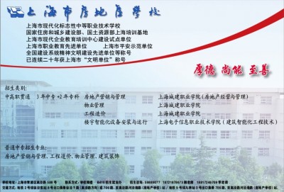 上海市现代化标志性中等职业技术学校 国家住房和城乡建设部、国土资源部上海培训基地 上海市现代企业教育培训中心建设试点单位 上海市职业教育先进单位 上海市平安示范单位 全国建设系统精神文明建设先进单位等称号 已连续二十年获上海市“文明单位”称号 招生类别: 中高职贯通 3年中专+2年专科 房地产营销与管理 上海城建职业学院(房地产经营与管理) 物业管理 上海城建职业学院 工程造价 上海城建职业学院 楼宇智能化设备安装与运行 上海电子信息职业技术学院(建筑智能化工程技术) 普通中专招生专业: 房地产营销与管理、工程造价、物业管理、建筑装饰 学校地址:上海市青浦区高泾路588号 联系方式:学校南楼 B410 招生就业办 招生咨询:59889077 18721878673 韩老师 18817246709 李老师 交通方式:地铁2号线徐泾东站8号出口换乘徐泾5路(高泾路方向)或706路,至高泾路河泾港路(房地产学校)站/地铁9号线九亭站3号出口换乘706路,至高泾路河泾港路(房地产学校)站。