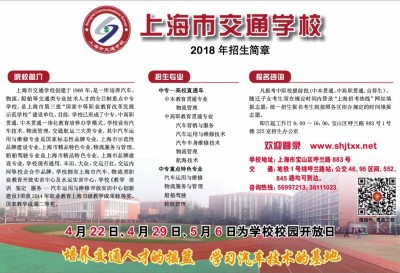 院校简介 上海市交通学校创建于1960年,是一所培养汽车、物流、船舶等交通类专业技术人才的全日制重点中专学校,是上海市第三批“国家中等职业教育改革发展示范学校”建设单位。目前,学校已形成了中专、中高职贯通、中本贯通一体化教育培养办学模式。学校设有汽车技术、物流管理、交通航运三大类专业, 其中汽车运用与维修专业是国家标志性品牌专业、上海市示范性品牌建设专业、上海市精品特色专业,物流服务与管理、船舶驾驶专业是上海市精品特色专业、上海市品牌建设专业。学校现有通用、丰田、大众,交运日红、交运内河等校企合作品牌。学校拥有上海市汽车、物流类职业教育开放实训中心及水运实训中心,学校《教学 培训 鉴定 服务--汽车运用与维修开放实训中心创新建设》荣获2014年职业教育上海市级教学成果特等奖、国家教学成果二等奖。 招生专业 中专—高校直通车 中本教育贯通专业 物流管理 中高职教育贯通专业 汽车营销与服务 汽车运用与维修技术 汽车车身维修技术 物流管理 航海技术 中专重点特色专业 汽车运用与维修 物流服务与管理 船舶驾驶 轮机管理 报名咨询 凡报考中职校提前批(中本贯通、中高职贯通、自荐生)、随迁子女考生须在规定时间内登录“上海招考热线”网站填报志愿;统一招生报名考生则按照各区招办规定的时间填报志愿。 即日起工作日8:00~16:00,宝山区呼兰路883号1号楼225室招生办公室 欢迎登录 www.shjtxx.net 学校地址:上海市宝山区呼兰路883号 交通:地铁1号线呼兰路站;公交46、95区间、552、845路均可到达。 咨询热线:56997213、36111023 4月22日、4月29日、5月6日为学校校园开放日 培养交通人才的摇篮 学习汽车技术的基地