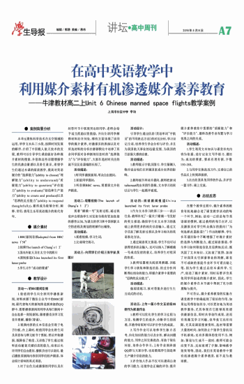 在整个教学过程中,媒介素养的教育有机地融合进了课堂教学活动的每一个环节。例如,活动一已经是每节英语课的惯例,通过教师的每日点评,以及播报员对学生听众偶尔的提问(“为何选择此篇报道?”)作出的解释,学生在耳濡目染中不断增强了对媒介素材的选择与判断能力。通过阅读报道,学生学习如何筛选信息及思辨地反应,既巩固了文本知识,又拓宽了视野,加深了对我国太空探索事业的理解。课堂不可或缺的家庭作业环节可谓点睛之笔,因为学生通过总结本课所学,生产、创造了媒介素材,同时还要评价其他同学所创造的媒介素材。因此,学生的媒介素养在本节课中得到了充分的熏陶与提升。