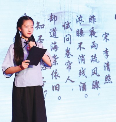 我们从小就朗朗上口的古诗词,你能想象将它翻译成英文的样子吗? 以水墨画为背景,身着汉服,以中、英文双语朗读中国经典古诗词,又是怎样一幅场景? 4月25日,2017-2018上海青少年“英语朗读者”活动总结展示在中国福利会少年宫落下帷幕。32名优秀的小朗读者代表,为台下观众带来经典诗词的中英文朗读视听盛宴。 该活动由上海青年国际文化交流中心联合SMG文广互动电视、《学生导报》、《东方少年》报以及英孚教育共同推出,面向全市青少年的校园英语互动朗读活动。 把自己游历各个城市的所见所闻在一个简洁的世界地图上展现出来;把自己融入到一个精致的水墨动画里,将自我介绍和两篇古文融合成一体,一气呵成……现场展示中,选手们精心准备,在朗读中融入了自己的奇思妙想。 小学组贾天怡同学是全场唯一一个用吟唱方式进行演绎的选手。“我是听着谷建芬的新学堂歌长大的。”贾同学告诉记者,最近热门的《经典咏流传》节目给了她这样的灵感:“和诗以歌,把经典的古诗词结合我们喜欢的曲调进行传诵,能使这些经典的诗词焕发新时代的魅力。” 该活动从2017年10月启动,全市40余所中小学校、超过10万名师生参与了线上和线下的朗读活动。主办方表示,通过双语朗读经典诗词来传播中国传统文化,提升当代青少年的双语能力,锤炼核心素养,帮助他们在未来的工作和学习过程中更具备国际视野,实现跨语种跨文化环境下的分享与沟通,成为融会贯通中西方文化精髓的时代精英。