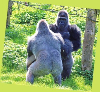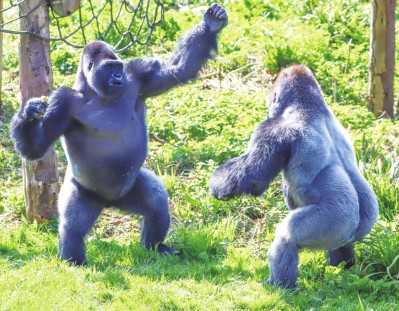 英国德文郡的佩恩顿动物园,两头西部低地大猩猩为争夺食物,看起来是要进行一场拳击赛。动物园的饲养员们将这场争夺称之为阶级战争。画面中,低阶级的猩猩Kivu努力地保护着自己的食物不被中级的大猩猩Kiondo夺走。园内的一名游客拍摄下了这些画面。